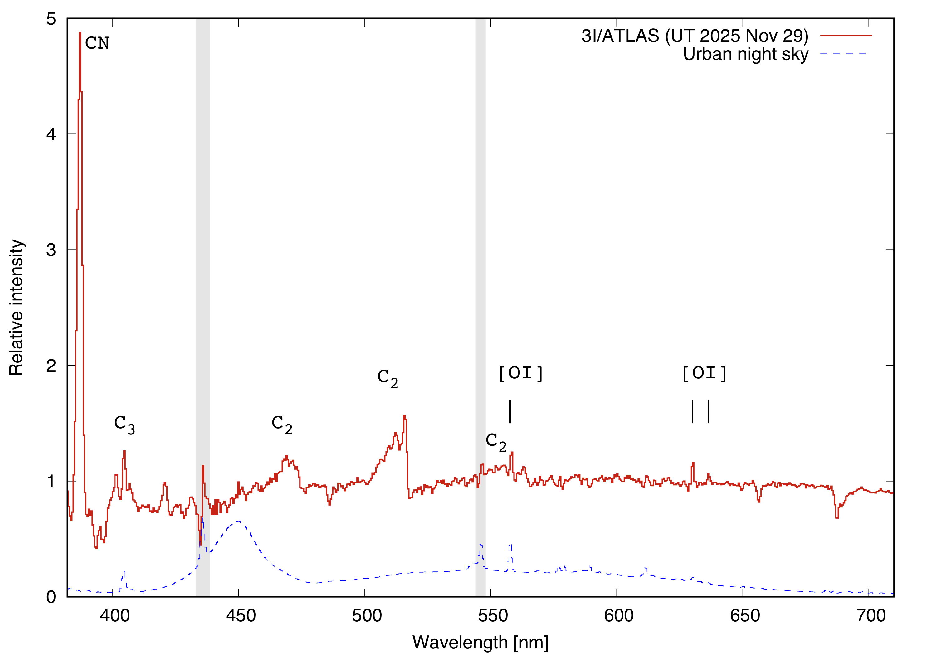 京都産業大学の神山天文台(神山宇宙科学研究所)では11月29日夜(30日未明)、この恒星間天体3I/ATLASを、口径1.3m荒木望遠鏡と可視光・低分散分光器LOSA/F2を用いて観測することに成功しました。その結果、恒星間天体3I/ATLASは、可視光線波長域では、太陽系に通常見られる彗星とよく似たスペクトルを示していることがわかりました。これは、3I/ATLASに含まれる氷成分が、太陽系の彗星と大きくは違わない、ということを示唆しています。可視光線波長域には、CN、C3、C2といった分子の発光と、酸素原子による発光(酸素原子の禁制線発光:[O I])が見られています。これらは、太陽系の彗星でも一般的に見られるものです。ちなみにここで発光しているCN分子は、もともとHCN分子が彗星核からガスとして放出され、太陽の紫外線によってCNとHに壊れてできたものと考えられています。発光している酸素原子も、もともとはH2Oだったものが、同様に太陽の紫外線で壊れてできたと考えられます。一方、3I/ATLAS彗星では、太陽系の彗星には一般的に見られるNH2分子の発光が弱いように見えます。もしかすると、3I/ATLASが誕生した他所の星の周囲環境が、太陽系とは異なっていたのかもしれません(最近の他の観測でも、太陽系彗星との違いがいろいろと指摘されています)。