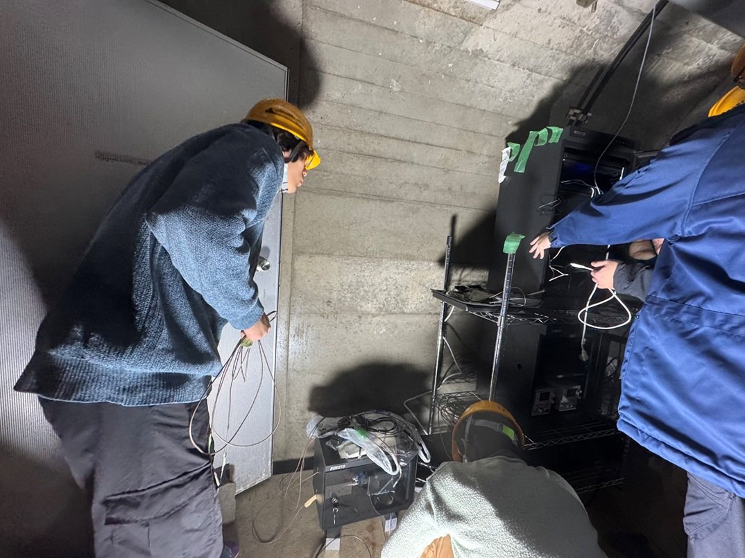 阿蘇山の坑道でのミューオグラフィ測定を開始するための予備実験として、京都大学・大阪大学との共同研究で、宇宙線ミュー粒子測定用放射線検出器を阿蘇山の坑道に設置し、試験観測を開始しました。卒業研究では、気象データと宇宙線測定データとの相関を研究し、卒業論文として仕上げようとしています。学内での普段の実験とは異なり最先端の研究施設に触れることで、様々な学びを得られたと思います。