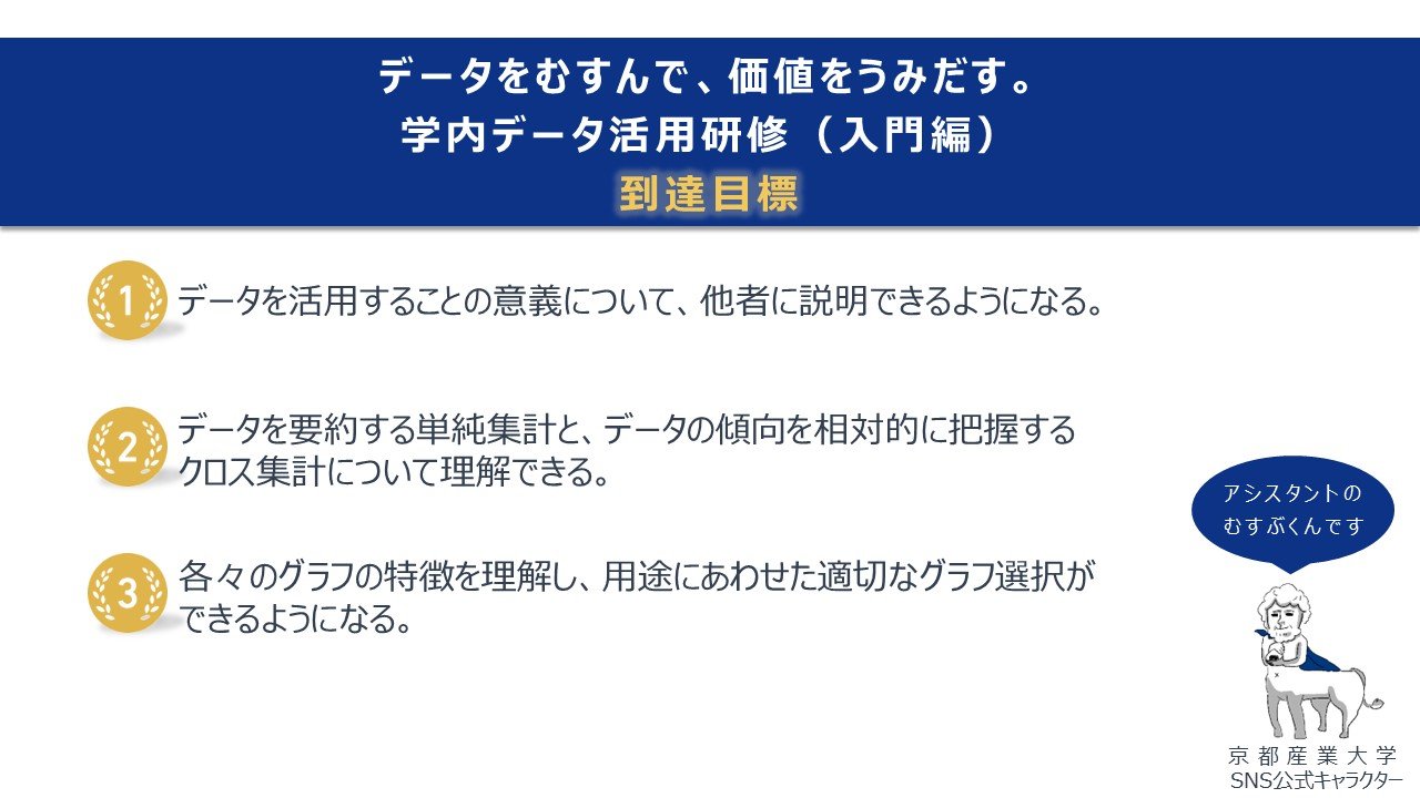 京都産業大学では、大学DX(デジタルトランスフォーメーション)を推進しており、データを活用するための研修に加えて、業務の効率化やデータ収集の仕組みづくりに関する研修も企画しています。今後も、データの収集・活用能力や業務効率化のスキル向上を目指し、さまざまな研修を実施してまいります。