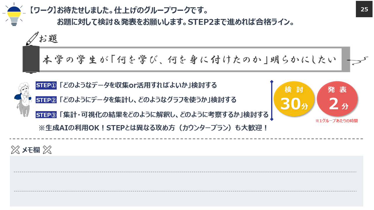 研修最後のグループワークでは、受講者同士が出された課題について活発に意見を交わし、多様な視点から議論を深めていました。その過程では生成AIも効果的に活用しながら、具体的な解決策を導き出すことができていました。
