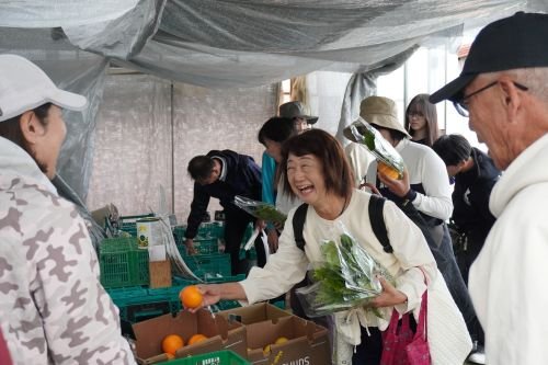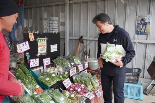 農産物直売所巡りでは、鈴木ゼミと町が協働で2024年度に制作した冊子「くみやま野菜直売所ガイドブック」とクリアファイル「食べよう! 歩こう! くみやまっ子」が、全参加者へ配布されました。今回の農産物直売所巡りは、「Aコース:全7ヶ所の直売所巡り」「Bコース:4ヶ所の直売所巡り×クイズ」「Cコース:4ヶ所の直売所巡り×歴史ツアー」の3つのコースからいずれか一つを選択して参加するもので、鈴木ゼミは信貴町長と同じAコースに参加しました。各直売所は新鮮な野菜を豊富に取り揃えており、参加者が野菜を求める様子が多く見られました。