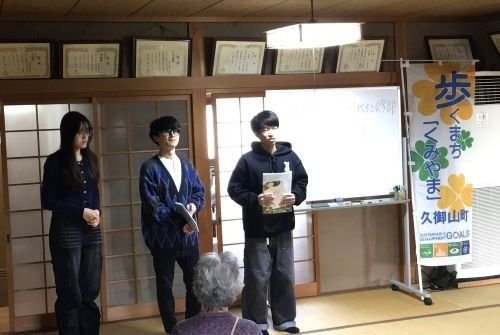 北川顔公会堂における休憩の場では、鈴木ゼミが久御山町と協働で制作した「くみやま野菜直売所ガイドブック」とクリアファイル「食べよう! 歩こう! くみやまっ子」、FMラジオ番組「久御山野菜College」でのMCなど、久御山町でのゼミ活動に関するエピソードや思いを語りました。