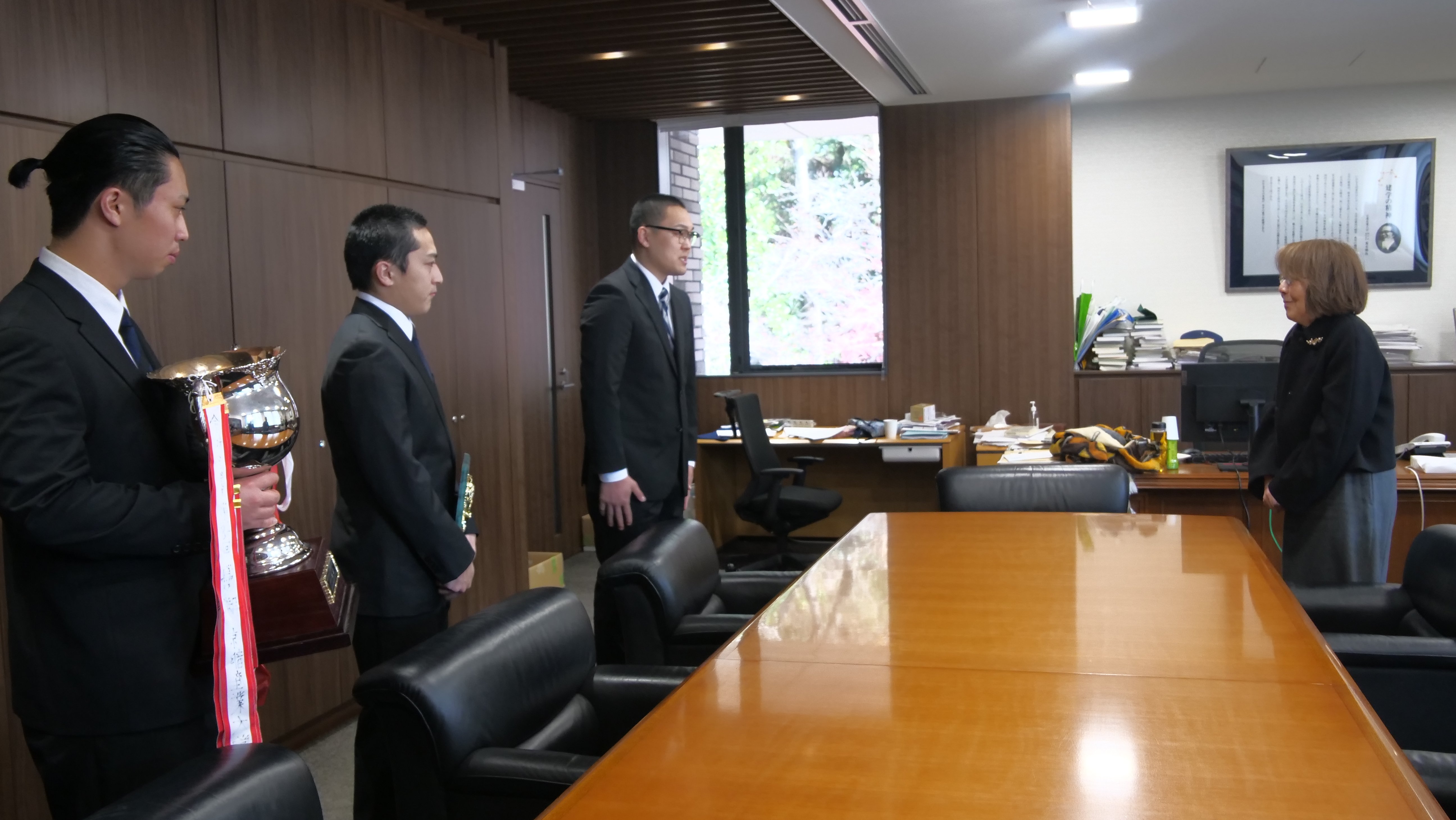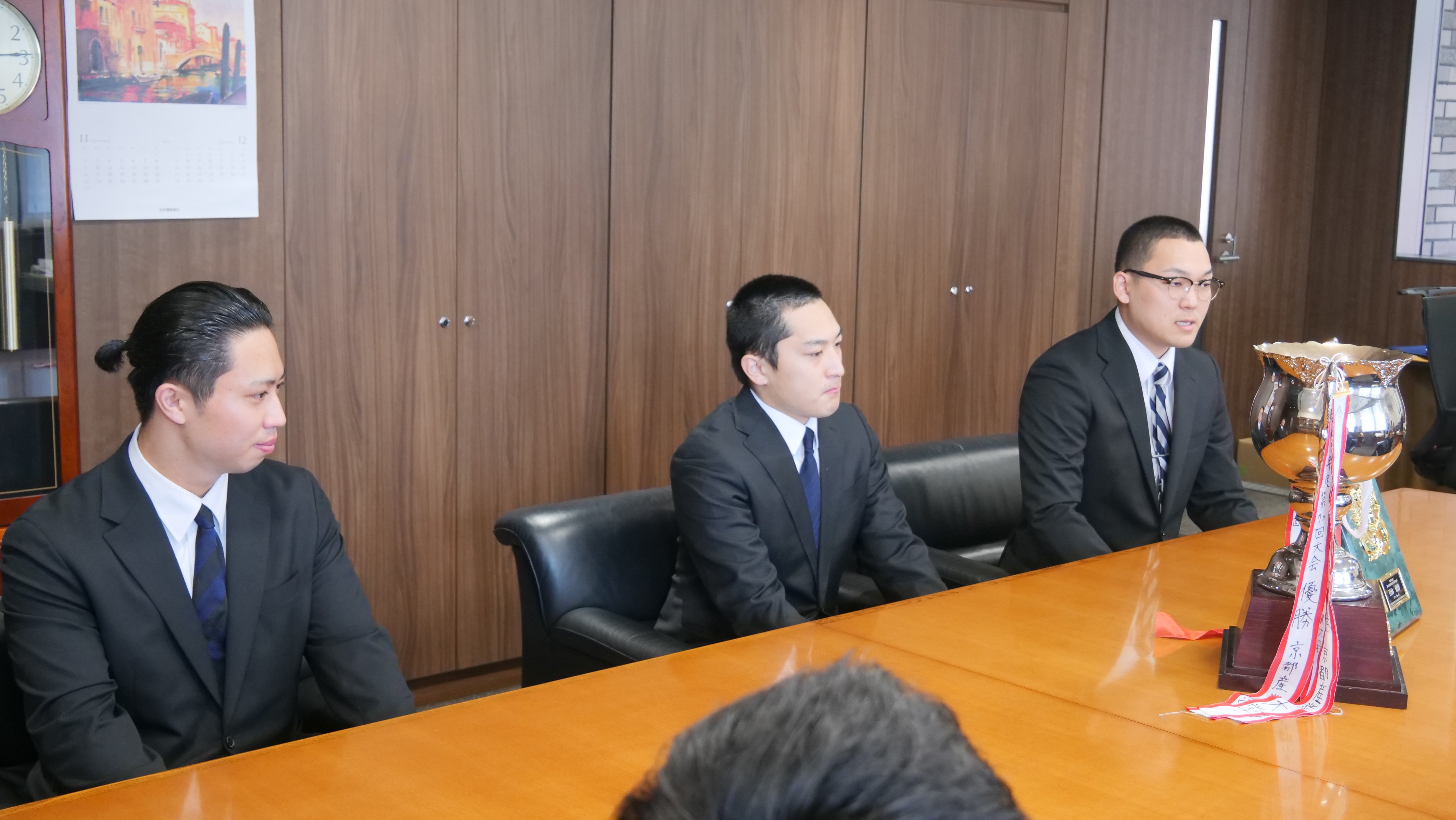 この結果について、12月10日、主将:服部 慎史さん(経済・4年次)、副主将:湯之上 智哉さん(法・4年次)、副主将:深澤 太陽さん(理・4年次)から学長に優勝報告が行われました。