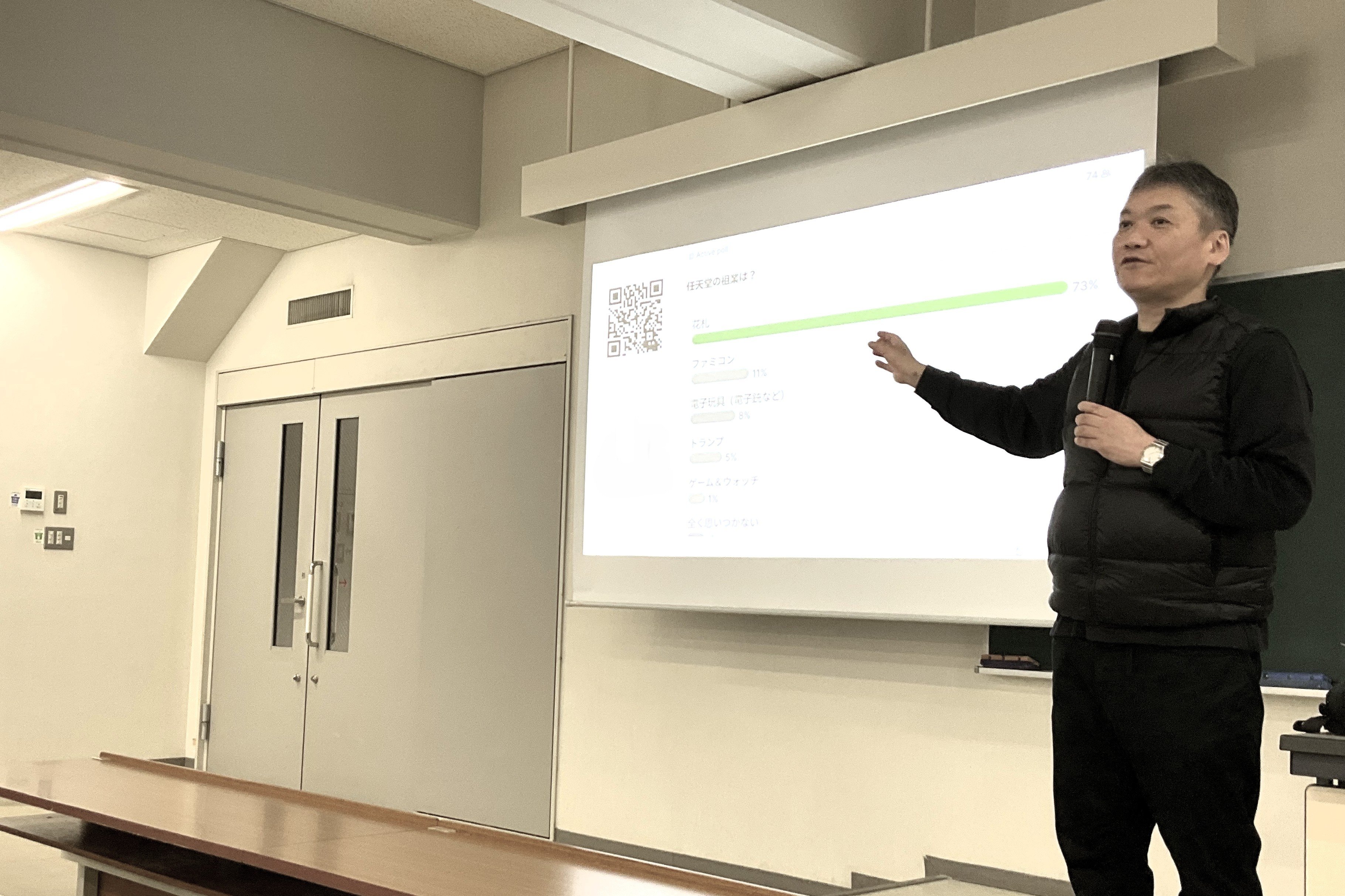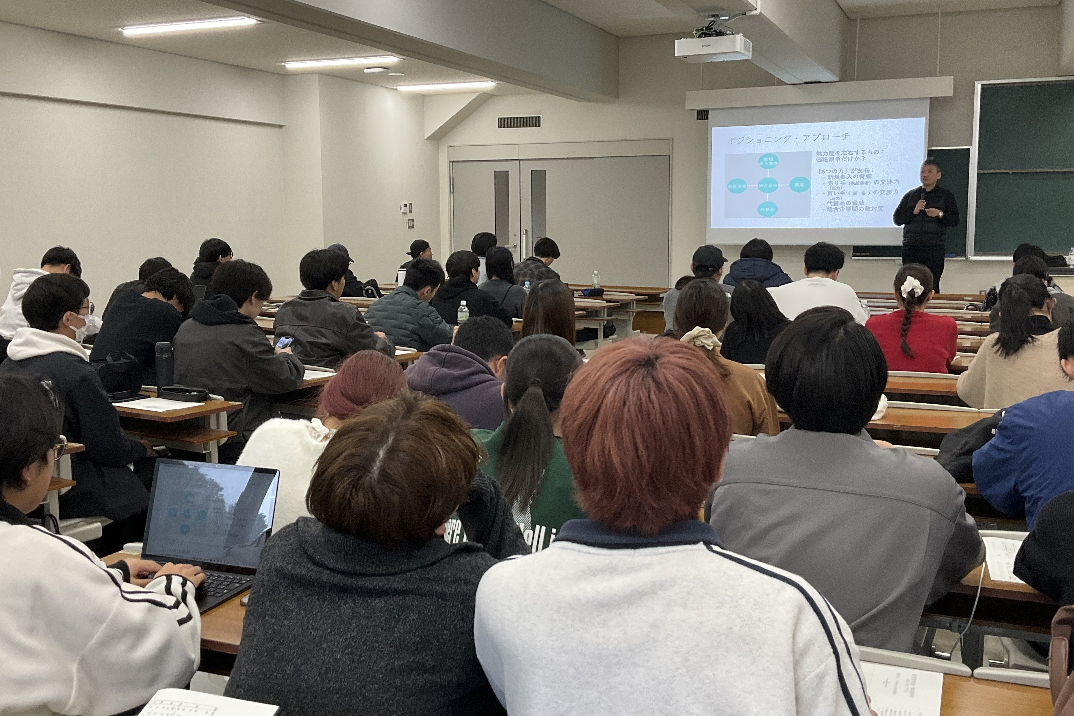 京都産業大学経営学部では、多様なゲストを招いた特別講義を多く実施しており、学生が普段とは異なる視点や、刺激を得られる貴重な機会となっています。今回は、森口 文博助教が担当する「経営戦略論(事業戦略)」の講義で、神戸大学経営学研究科 吉村 典久教授によるゲストスピーカー講演「非競争の競争戦略」を実施しました。