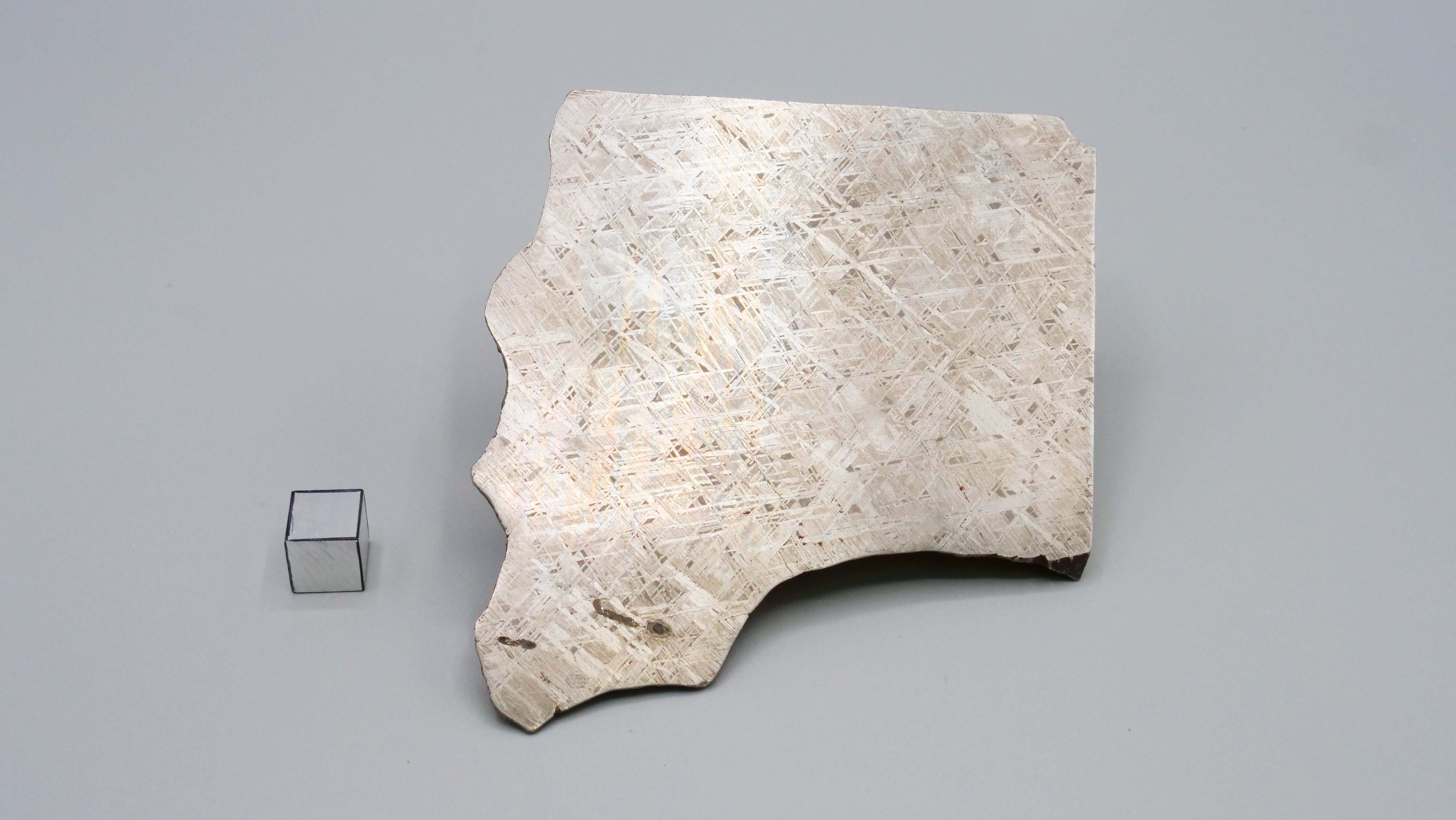 主に鉄・ニッケル合金からなる鉄隕石の一種で、現在のナミビア地域で発見されました。約4億5千万年前に地球に落下したと考えられています。断面を酸で処理すると「ウィドマンシュテッテン構造」と呼ばれる特徴的な模様が現れます。これは、太陽系形成初期に鉄・ニッケル合金が約100万年かけてゆっくり冷えた痕跡であり、人工的には再現できない、宇宙だけが生み出せる模様です。