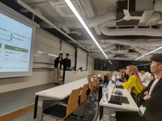 授業冒頭、田中氏の講演に先駆けて、学生から同社の訪日旅行メディアサービスの新規提案について優秀グループ2組が発表をしました。各班、ペルソナの作成や大まかな事業予定などを組み込んで発表しており、とてもレベルの高い発表となっていました。講評は田中氏に加え、本学卒業生で人事部で活躍されている竹内氏、マーケティング部に所属し動画メディアで著名なアンジー氏も加わり、プレゼンをさらにワンランクアップさせるアドバイスなどを学生に共有していただきました。