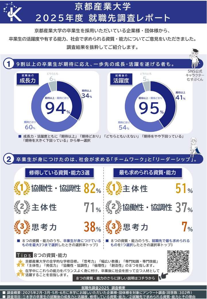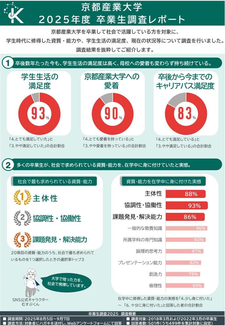 京都産業大学では、卒業生が在学中に修得した資質・能力を発揮して社会で活躍しているか等を明らかにするため、卒業生を対象とした調査と、卒業生の就職先を対象とした調査を毎年度実施しています。