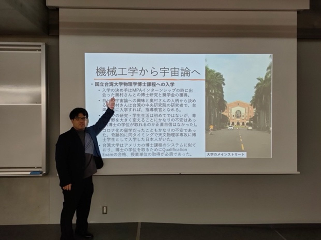 工学系で修士課程を修了後、ドイツ滞在時に出会った台湾 中央研究院 天文及天文物理研究所の奥村 哲平 教授に師事するため台湾大学の博士課程へ進学。基礎物理学諸分野の高度な学力が試される博士候補者資格審査という大きな関門を突破し、宇宙論分野で研究成果を重ね、今年2月に博士号を取得しました。