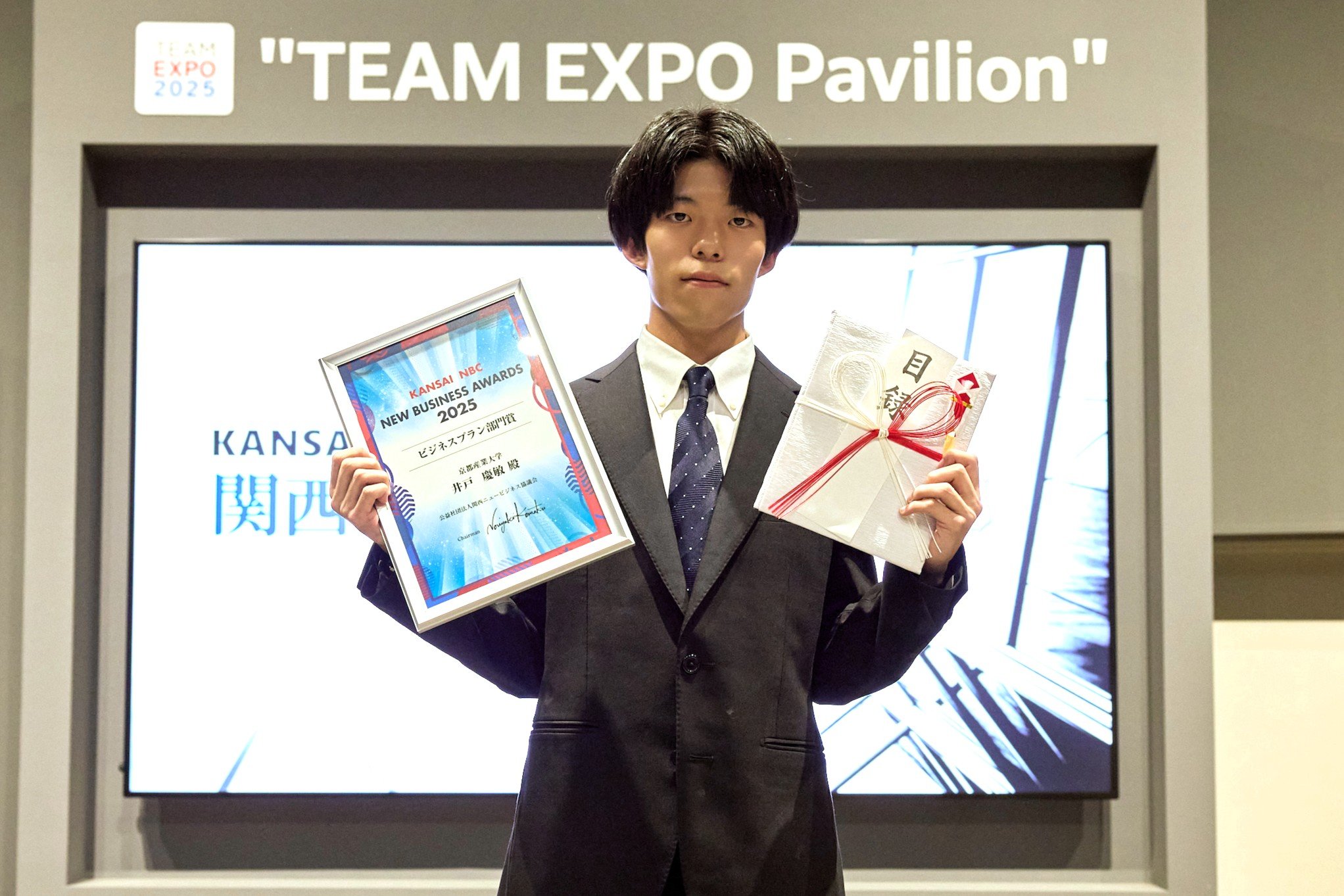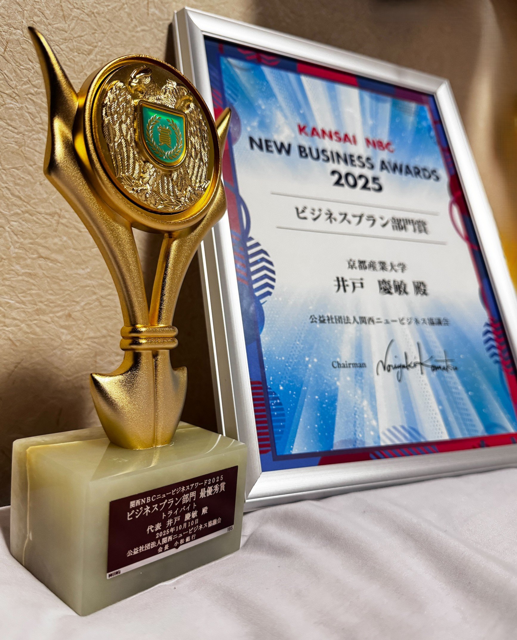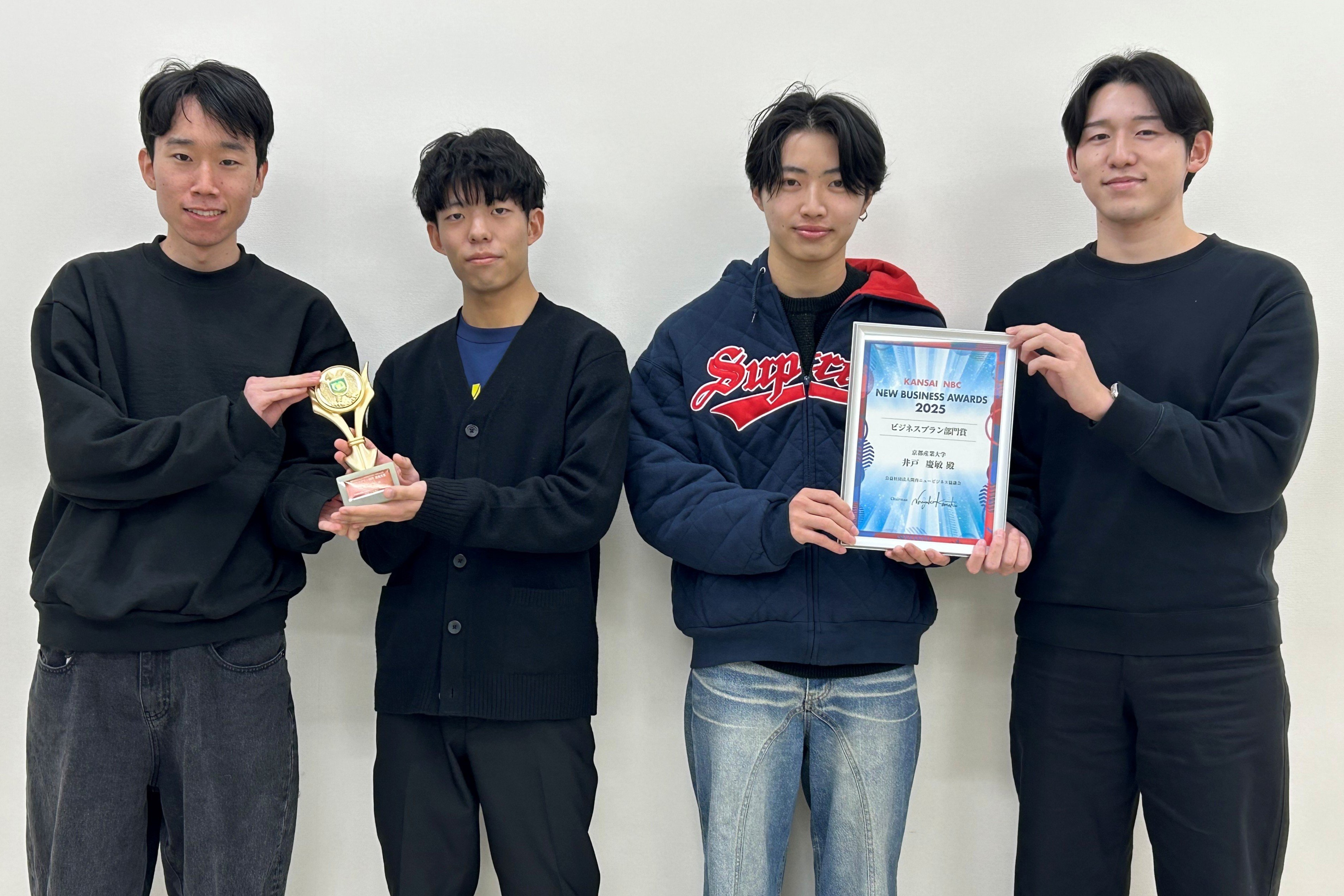 この度、経営学部 福冨 言ゼミ生(青木 優汰さん、井戸 慶敏さん、西川 瑞基さん、冷水 駿一さん、いずれも経営・3 年次生)が「関西NBCニュービジネスアワード2025」ビジネスプランの部にて、部門賞・最優秀賞を受賞しました。