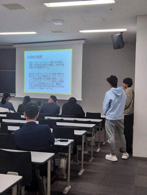 1日目、行待ゼミからは石田 心吹さんと土井 朝比さん(ともに経営・2年次生)の2人が参加し、「フリーランスのリスク」というタイトルで、近年、新しい労働形態として注目されているフリーランスのメリットとデメリットを紹介しました。また、この働き方の将来性についての議論と試案を提示し、明治大学中林ゼミ1班との討論に臨みました。