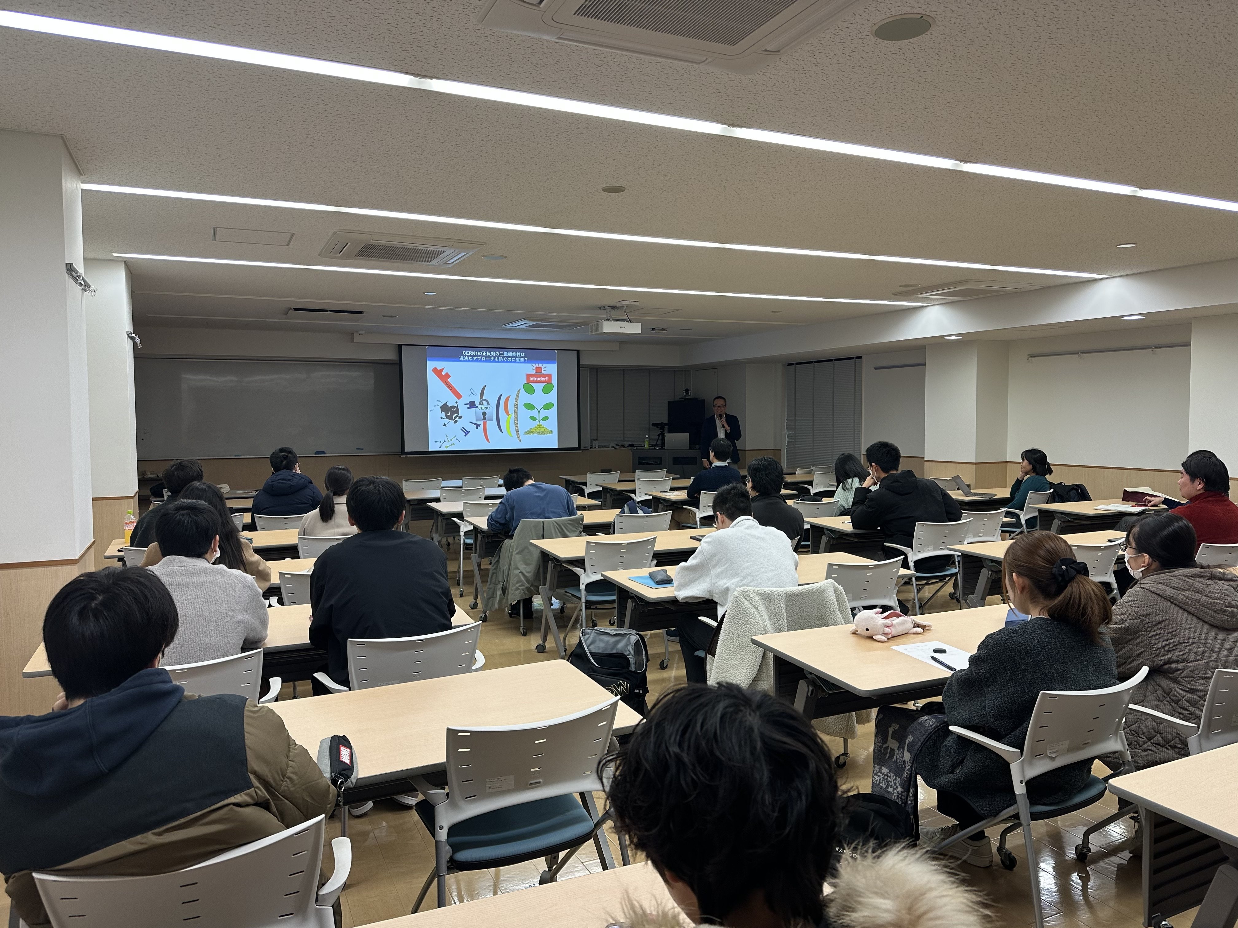 これらの仕組みは、植物が長い進化の過程で獲得してきたものであり、「信賞必罰」という原理が、安定した共生関係の維持に重要であることが示されました。本セミナーは、自然界の共生戦略から人間社会の協調のあり方を考える機会となりました。参加した学生からは、「自然界の植物と微生物の関係が興味深かかった」などの声が聞かれました。