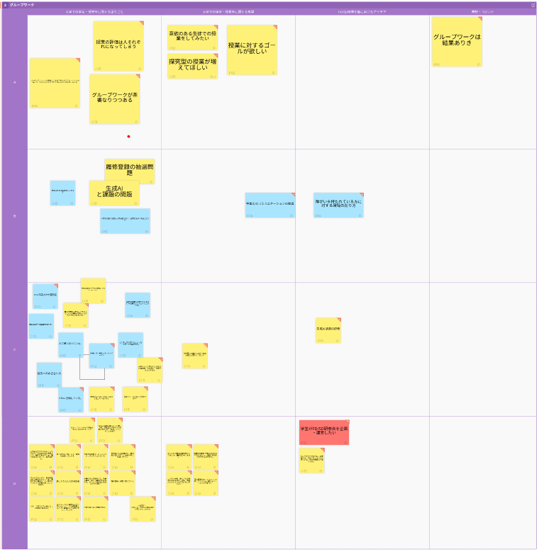 委員会では、企画委員と複数学部から参加した学生が4グループに分かれ、オンラインホワイトボードツール「Stormboard」を用いて、「① 学習や授業に対する困りごと・要望・希望」、『② ①の意見を基に「こんな研修会があればよい」というアイデア」について意見を出し合いました。