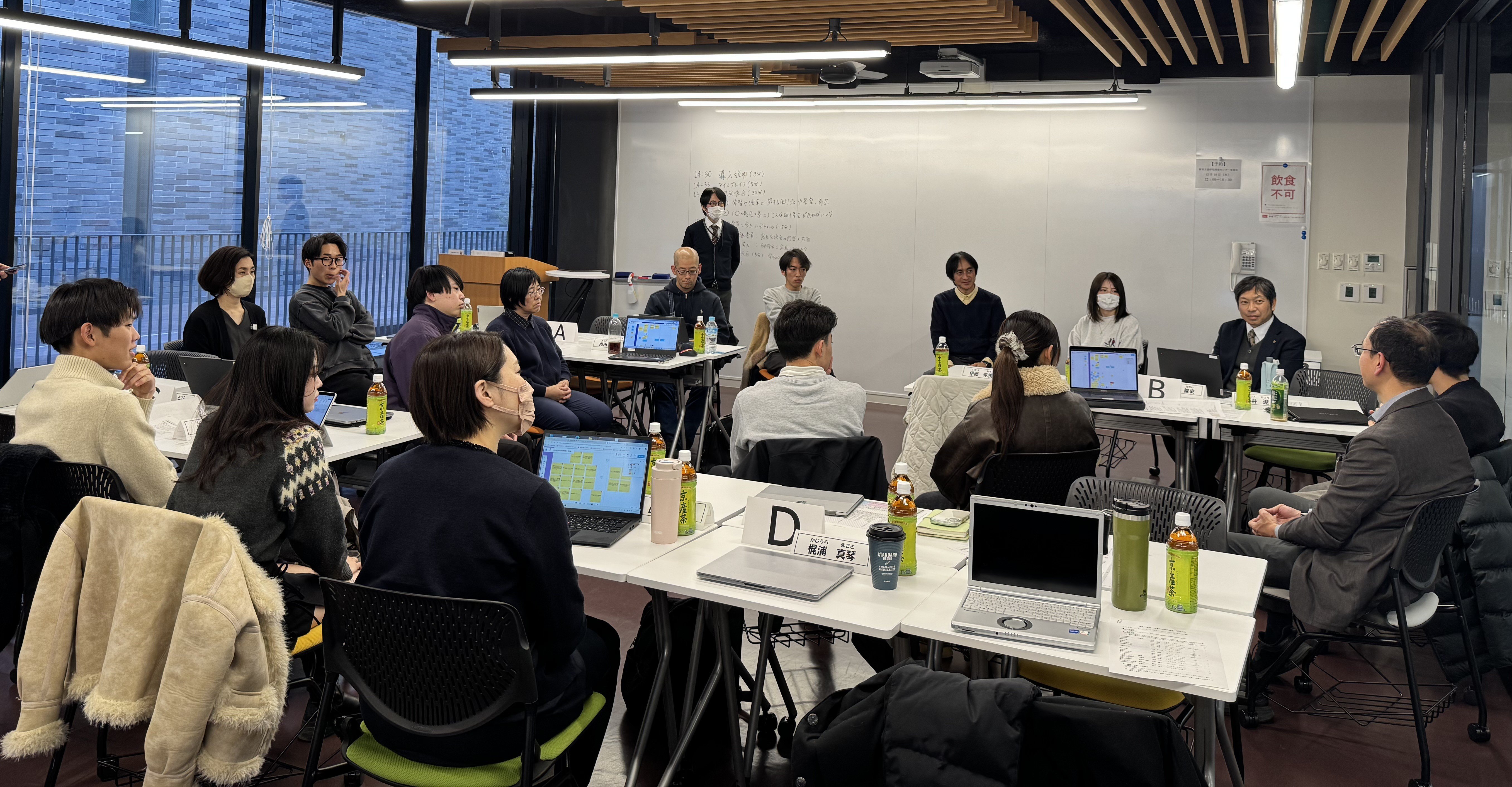 その後、企画委員と学生に分かれ、企画委員は意見交換会の内容共有や今後の検討を行い、学生は「もし自分たちが全学FD/SD研修会を企画するなら」というテーマで、仮の研修会のテーマと概要を大まかに企画する短時間のワークを行いました。
