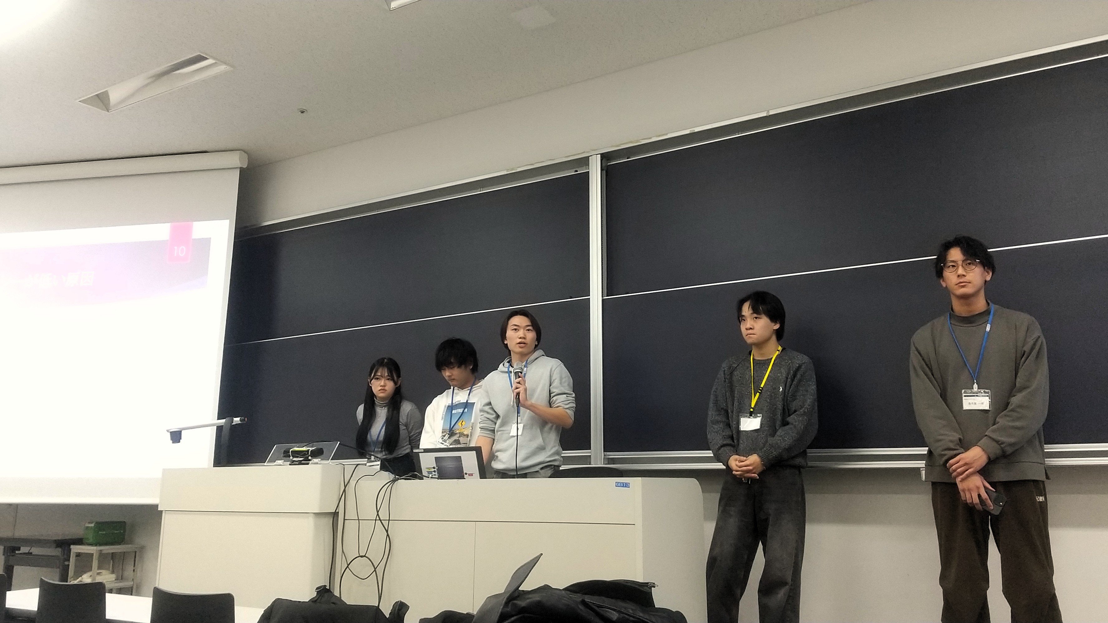 発表者:東 幹基さん(演習2ゼミ長、2年次)、工藤 匠さん(3年次)、尾山 太一さん、桑路 暖人さん、坂本 航基さん、谷間 悠人さん、宮木 寛次郎さん(いずれも2年次)