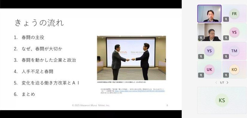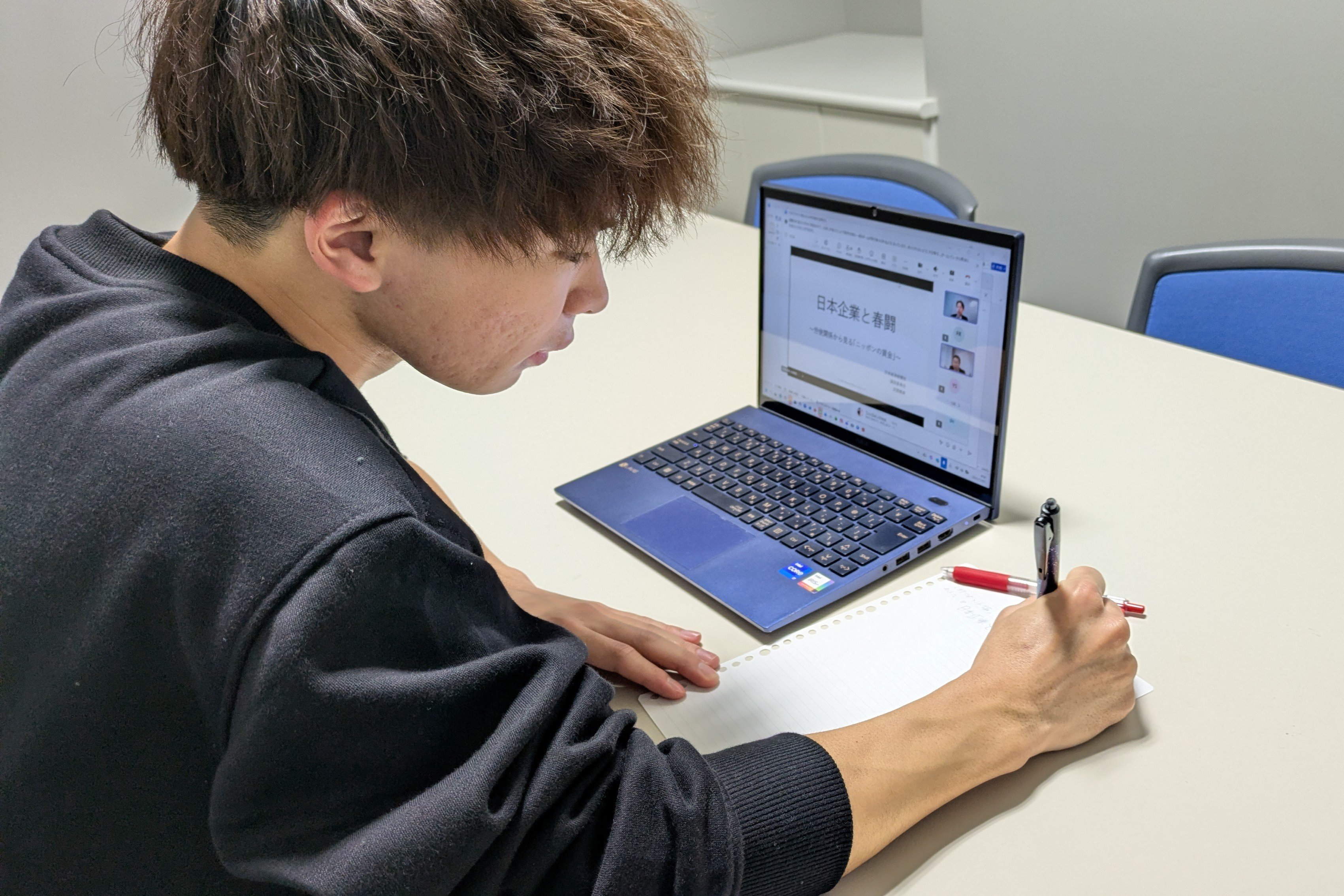 経営学部の「人材マネジメント論」(担当:篠原 健一教授)では、企業がどのように「ヒト」という資源を生かし、組織の成果に結びつけているのかを学んでいます。今回、「日本企業と春闘 ~労使関係から見る『ニッポンの賃金』~」をテーマに、日本経済新聞社の武類 雅典氏をゲストスピーカーにお招きし、オンライン講義を実施しました。その様子を取材しました。