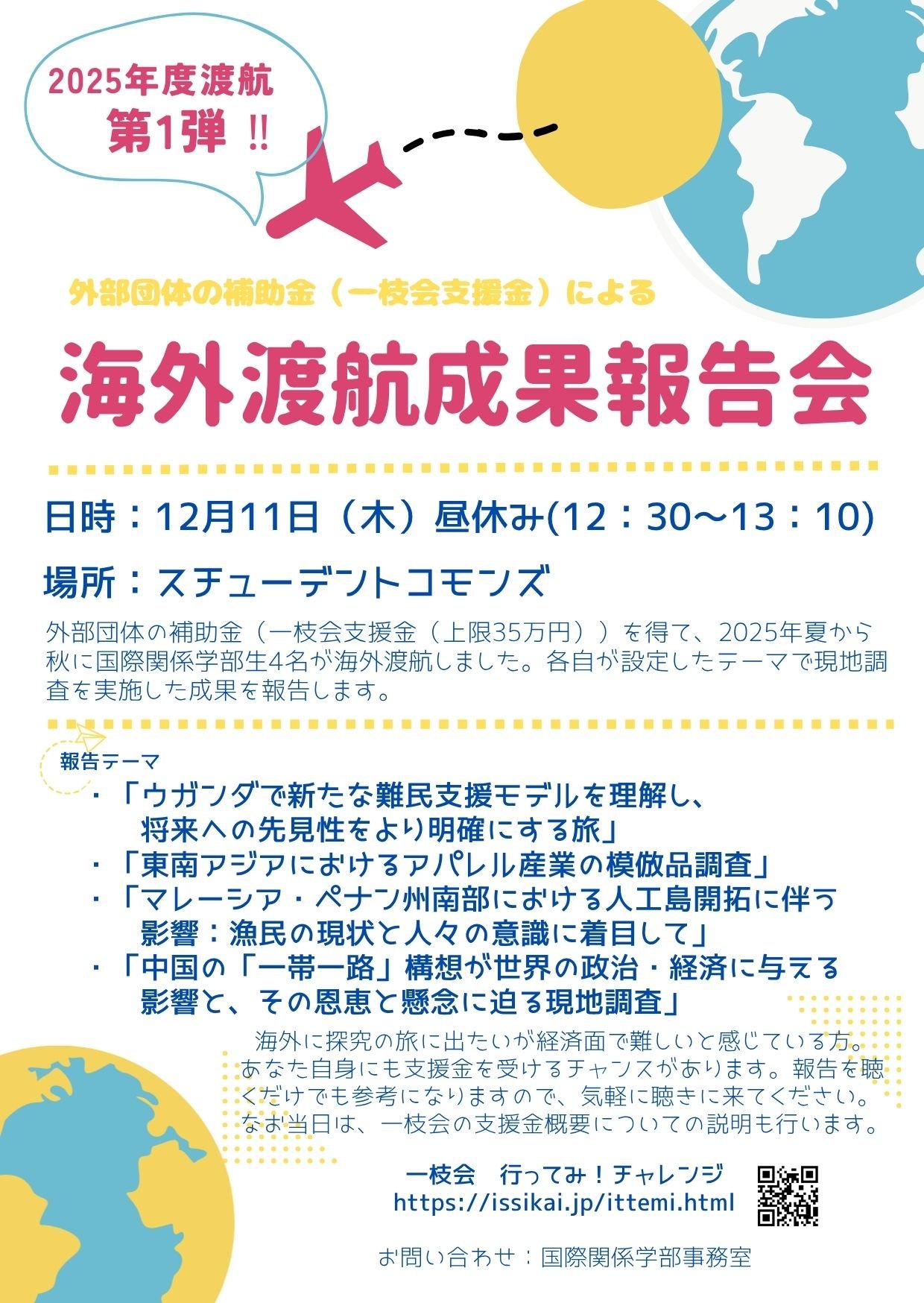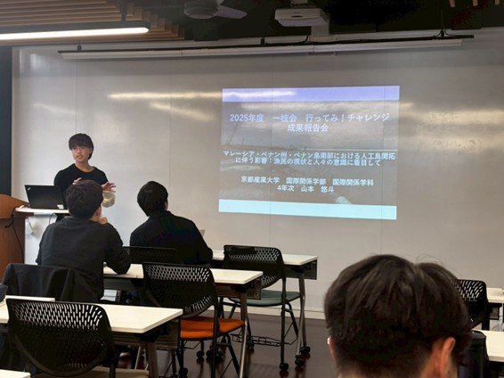 国際関係学部では、一般社団法人一枝会が主催する海外渡航体験計画支援制度「行ってみ!チャレンジ」を利用して海外調査を行った学生による成果報告会が開催されました。今回の報告会では、厳正な審査を経て採択され、2025年度に渡航を実施した4名の学生が、それぞれの調査成果や現地での経験について発表を行いました。