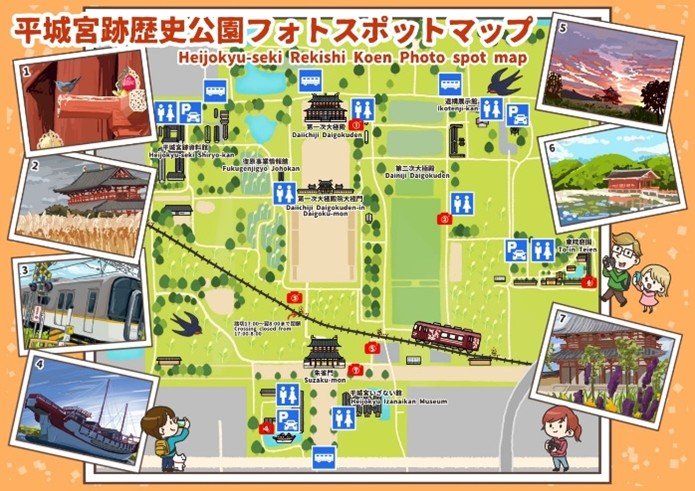 4月に現地を見学させて頂く中で、公園の豊かな自然と生き物・歴史的景観を公園の魅力として注目し、歴史に興味がある人だけでなく、地域の子供たちや海外の方にも幅広く平城宮跡歴史公園に関心をもってもらいたいとの考えから、『フォトスポットマップ』を企画しました。