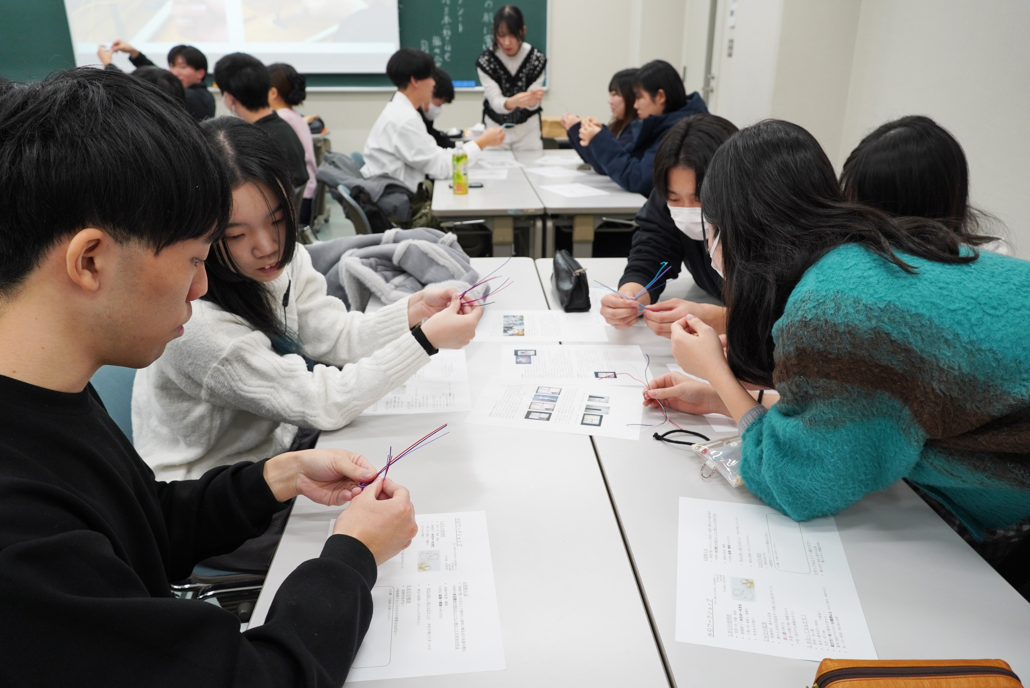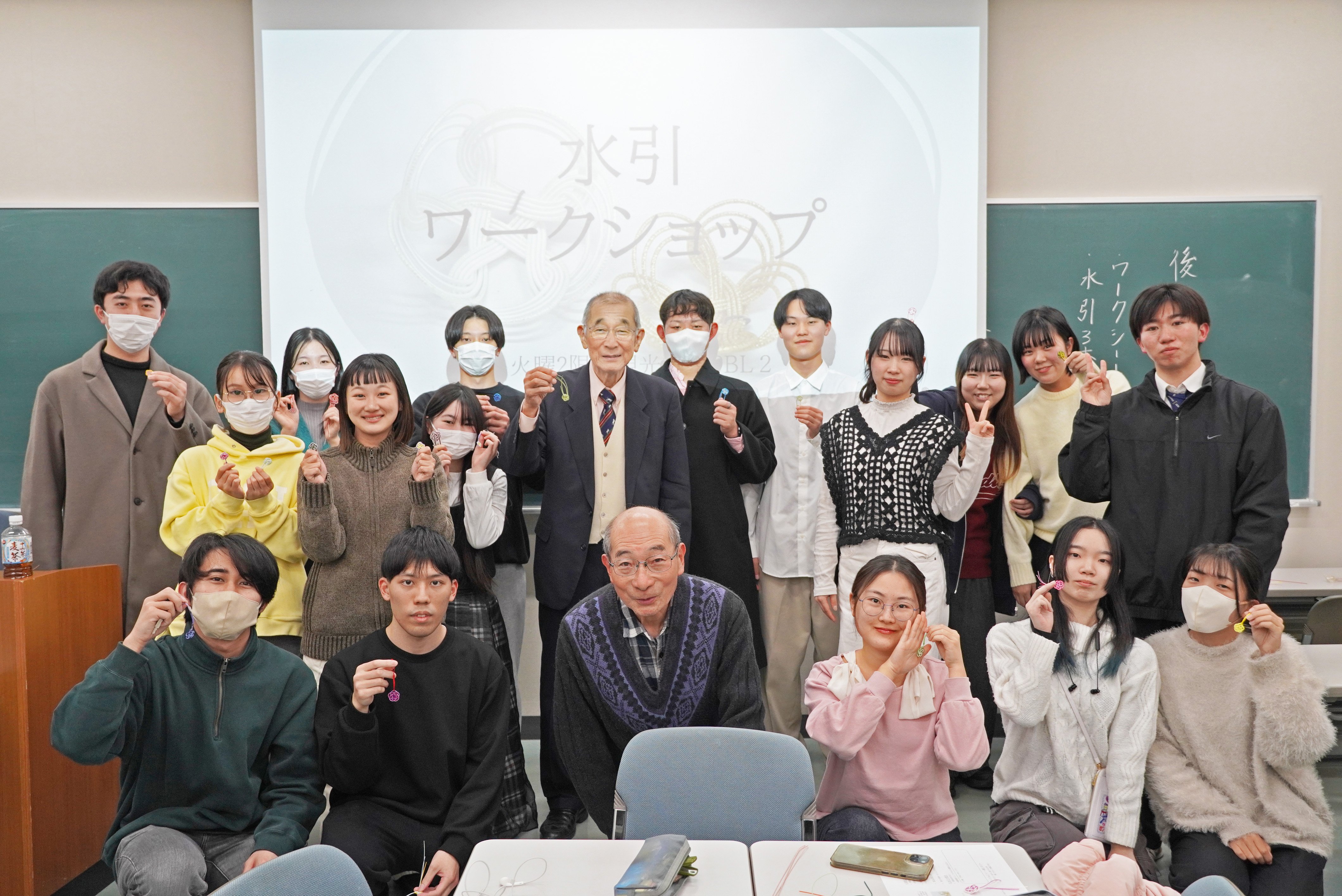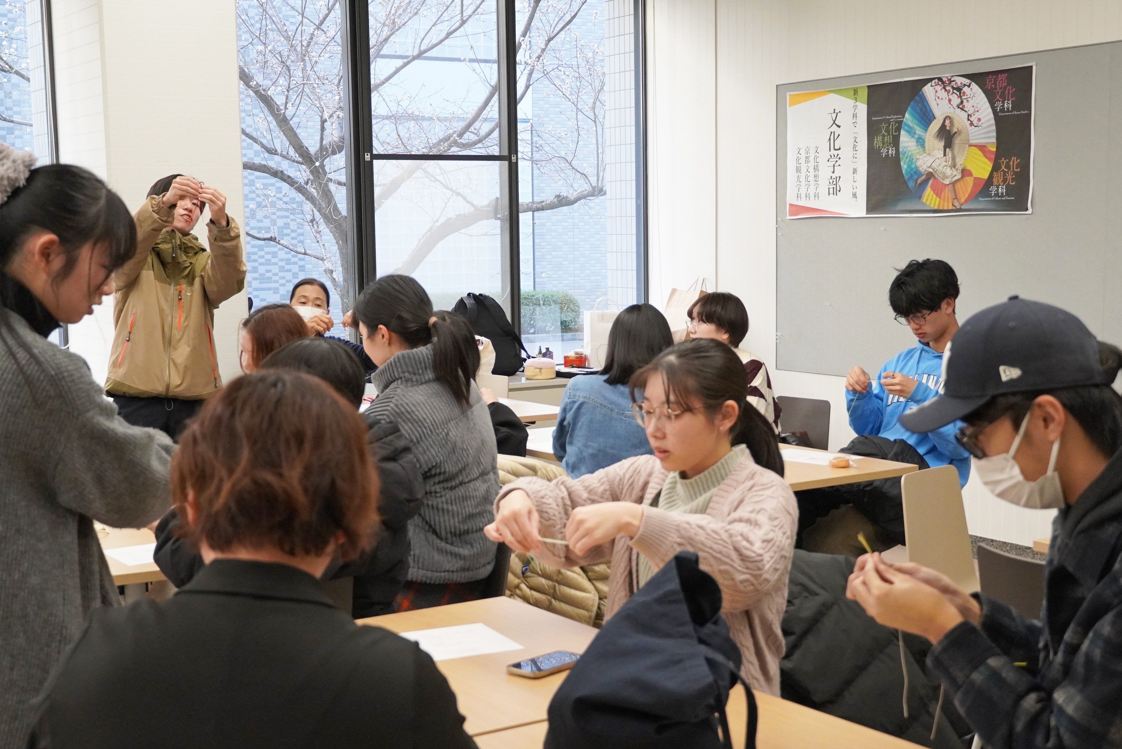12月15日(月)、文化学部専門教育科目「観光文化学PBL2」の受講生による水引ワークショップが開催されました。本企画は、同授業の伝統産業チームが中心となって企画・運営したものであり、平井水引工芸三代目の平井 喜久雄氏にご協力いただき実施されました。また当日は、PBLの課題提供元である京都伝統産業ミュージアム館長の八田 誠治氏にもご参加いただきました。