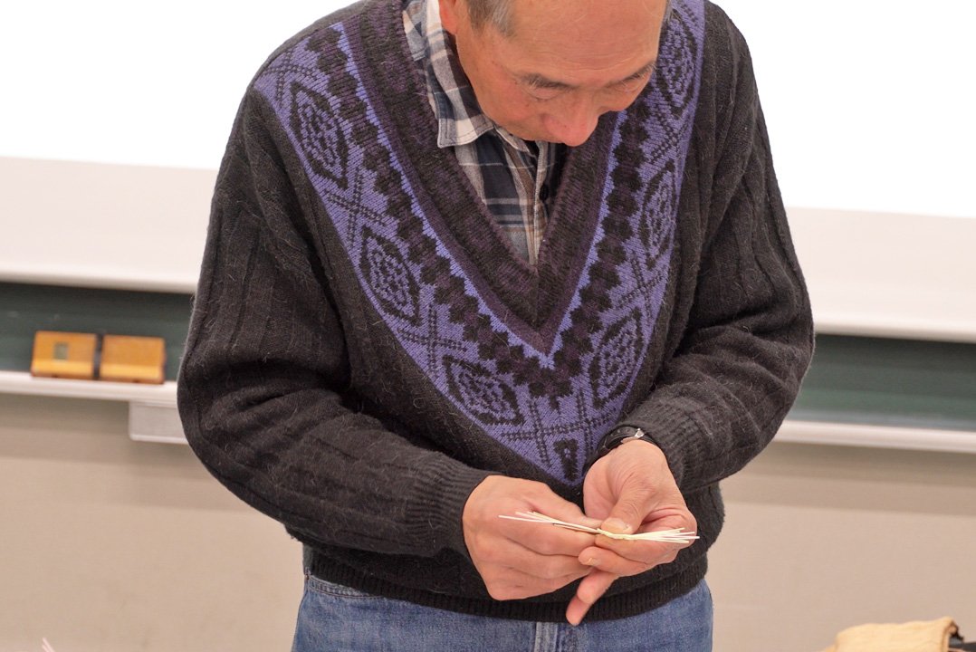 また、12月19日(金)には、受講生が主体となった水引ワークショップが開催されました。当日は17人が参加し、15日に開催した平井氏によるワークショップで得られた知識や経験を生かして、受講生自身が進行や制作指導を担当しました。参加者は、あわじ結びおよび梅結びの制作に取り組み、完成した作品を通して水引の魅力や伝統技法への理解を深めました。