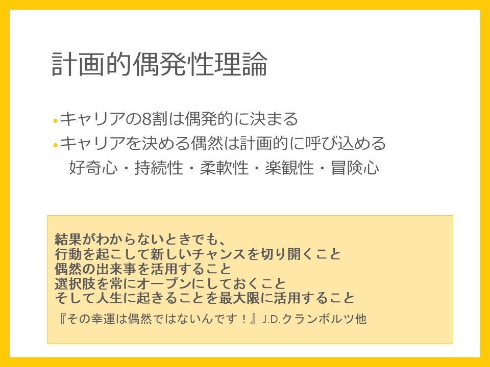 - 飛行機のパイロットの原則:どの会社でどの役職に就くかという「将来の予測」に基づくキャリア形成ではなく、自分の「好き・得意・経験」という自分軸(内発的動機)を起点に活動を開始