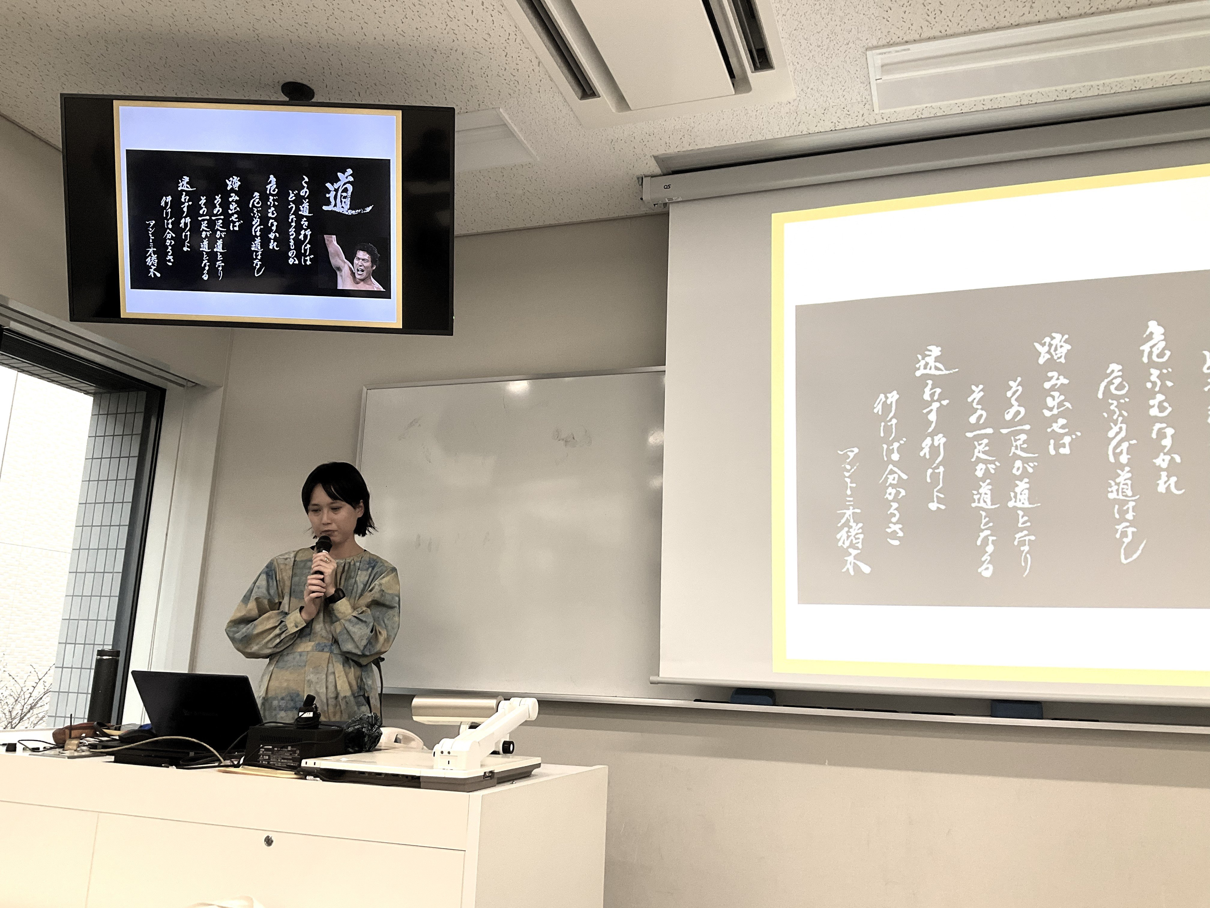 講演の最後には、「人生の8割は偶然で決まるが、その偶然は行動によって計画的に呼び込める」というJ・D・クランボルツの「計画的偶発性理論」も例に挙げました。さらに、アントニオ猪木氏の「この道を行けばどうなるものか。危ぶむなかれ、危ぶめば道はなし。踏み出せばその一足が道となり、その一足が道となる。迷わず行けばわかるさ」という言葉を紹介し、学生たちに「結果がわからなくても、面白そうと思ったことに一歩踏み出す重要性」を訴えかけました。