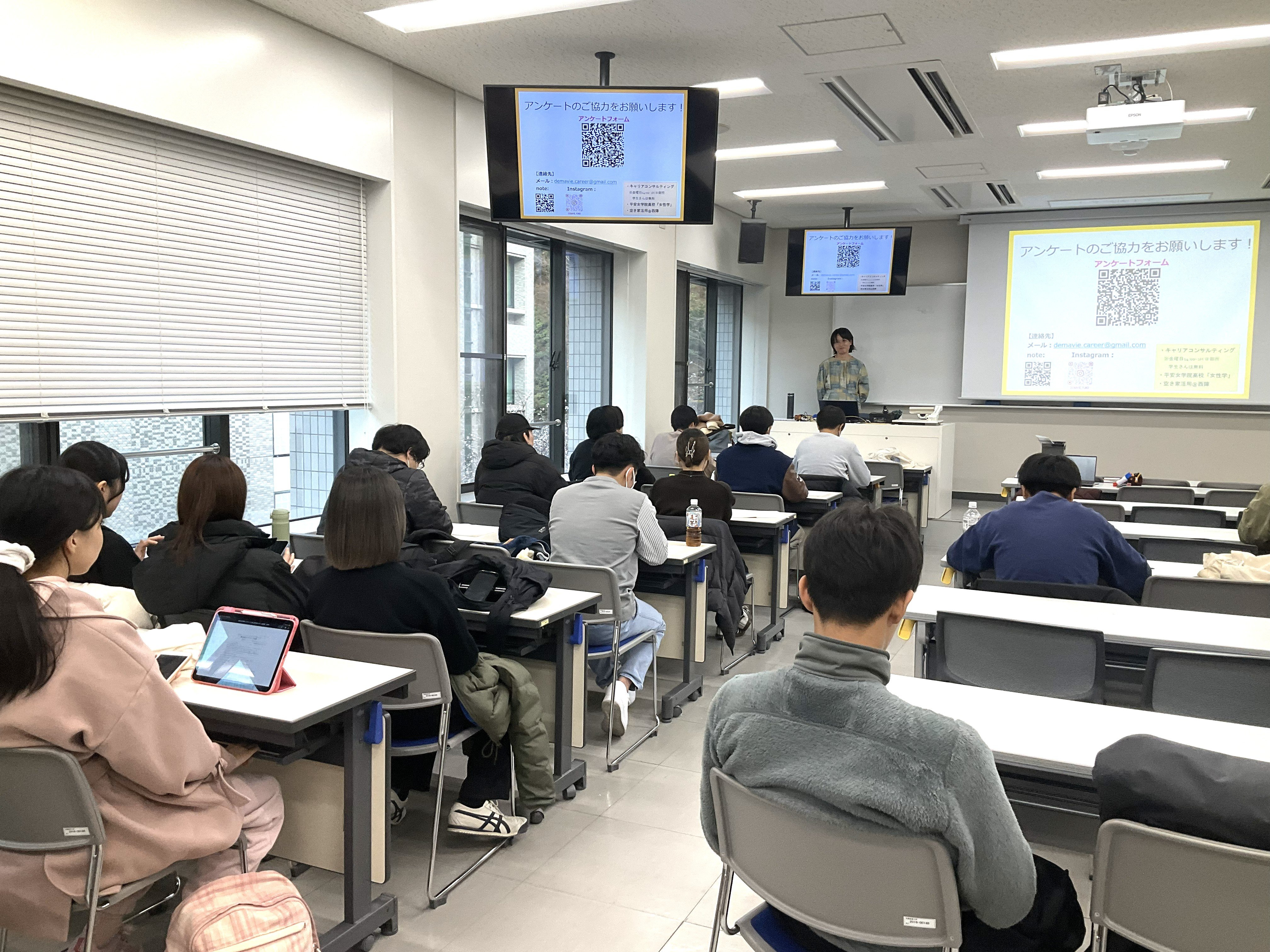 京都産業大学経営学部では、実践的なキャリアを持つゲストスピーカーを招いた特別講義を多く実施しており、学生たちが自らの未来を切り開くための具体的な戦略と、多岐にわたる選択肢を探る機会を提供しています。