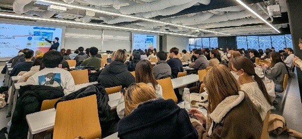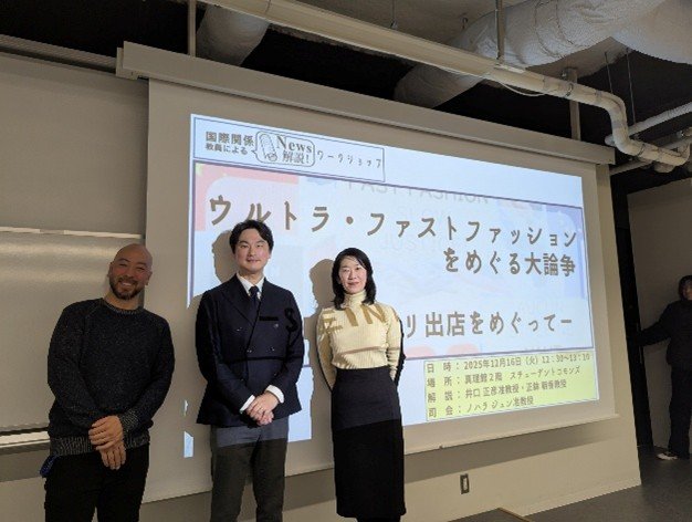 2025年12月16日(火)のお昼休みに「News解説ワークショップ」を開催しました。この企画は、国際関係学部の教員がタイムリーなニュースを学生に解説する国際関係学部独自の取り組みです。今回は、「ウルトラ・ファストファッション(SHIEN)とパリ出店をめぐる問題」というテーマのもと、正躰教授、井口准教授、ノハラ准教授の3名に、ウルトラ・ファストファションが抱える環境問題、EUの規制動向・消費者心理について解説していただきました。