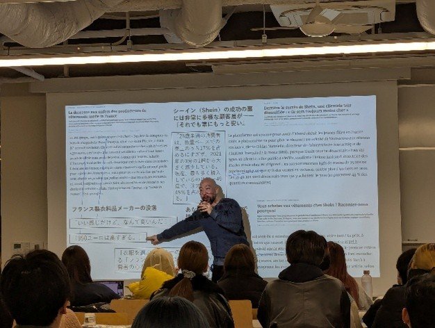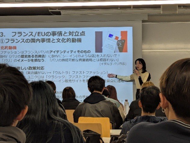 最後にノハラ准教授から、消費者心理と経済の視点での解説がありました。これほど批判されても、なぜSHEINは支持されるのかという点についてです。背景には、フランス国内の深刻なインフレと低賃金が存在すると話されていました。現地の若者や低所得者層にとって、給料が上がらない中でファッションを楽しむには、ウルトラ・ファストファッションの安さは生活の味方として機能しています。また、既存のフランス製ブランドが国民のニーズを満たせていない中、環境に悪いとわかっていても、背に腹は代えられないという消費者の切実な本音は、規制だけでは解決できない根深い問題だと話されていました。