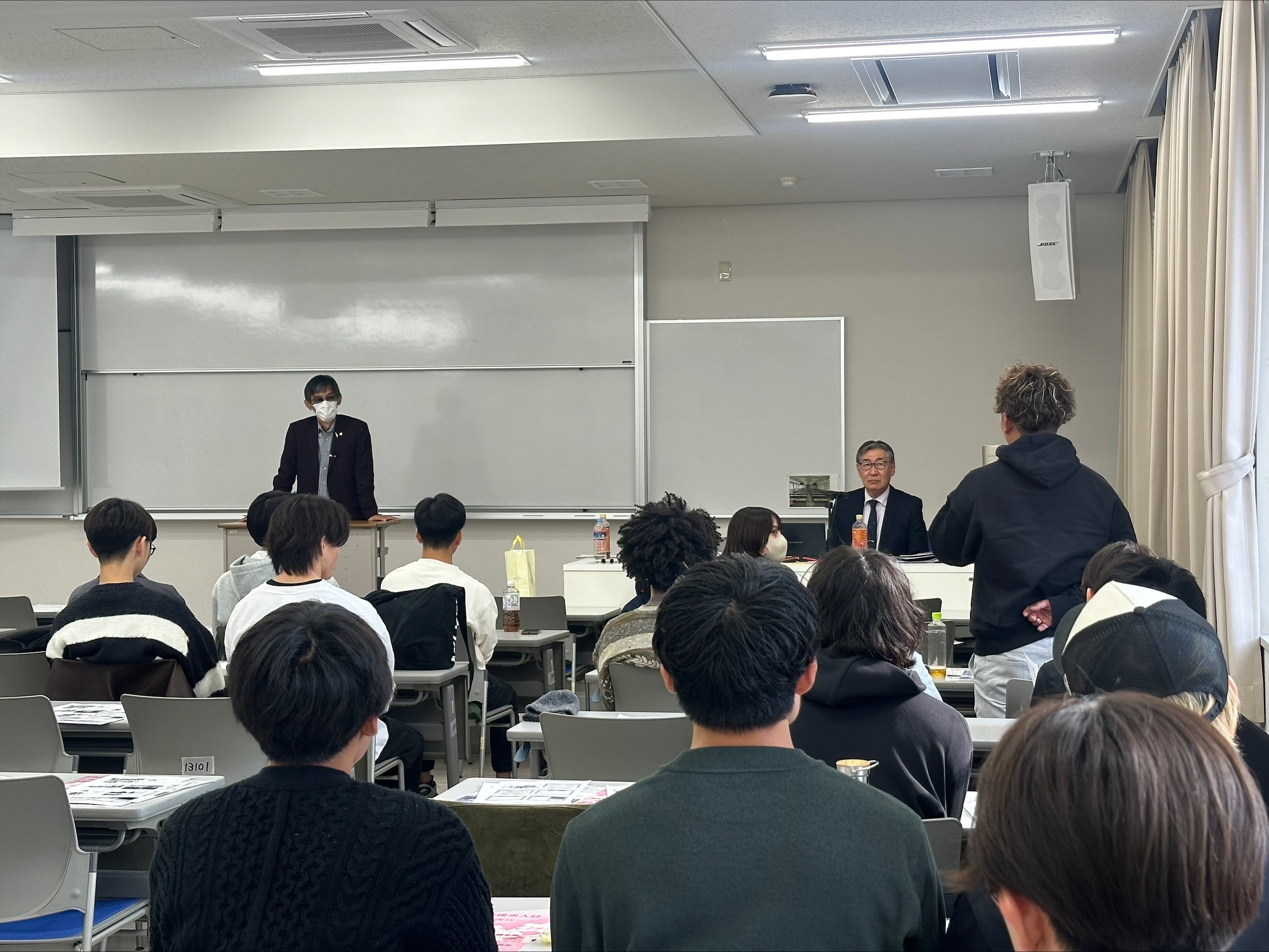 前半は中溝観光開発 取締役社長 中溝 茂寿さんによる特別講義、後半は京都府北警察署との連携・協同状況の説明を含む服部ゼミの取り組みの紹介と、服部ゼミ3年次 細間 凜音さんによるナミビアでの国連ボランティア活動について発表が行われました。