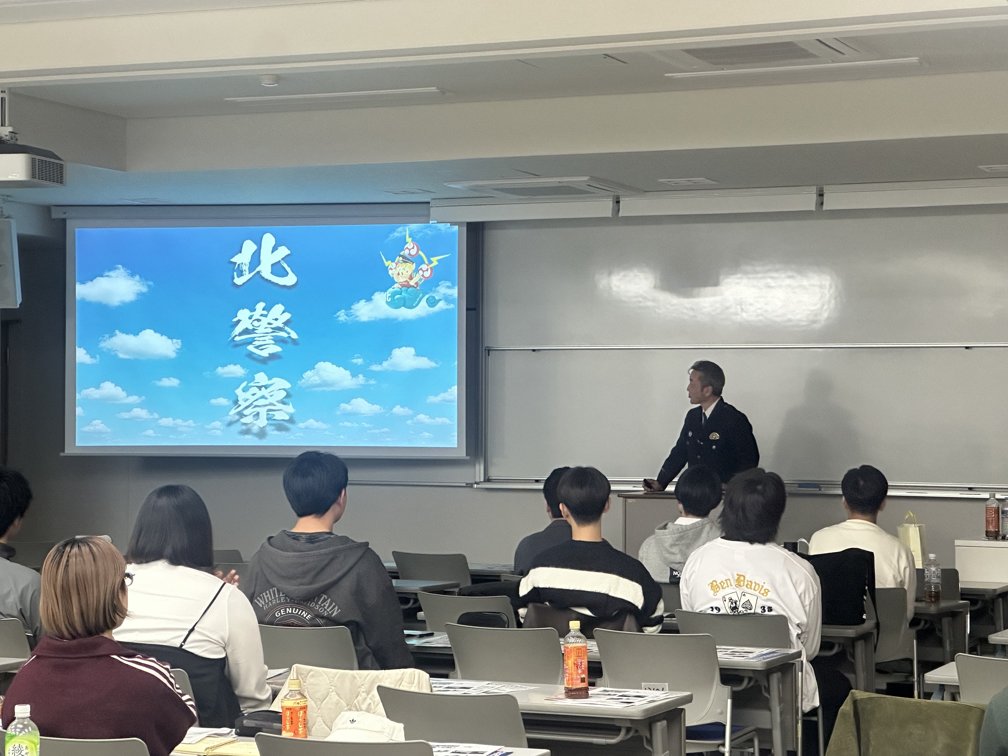 また北警察署 副署長の上田 幸則さんからは、自身の経験を踏まえ「社会情勢を正しく伝え訴えることも、警察官の重要な役割である」と服部ゼミの学びとも重ねつつ話をされました。さらに地域の方に本学をより身近に感じてもらうための交流イベント「サタデージャンボリー」への参加や、模擬面接の実施など、北警察署と本学および服部ゼミとの関わりについても説明されました。
