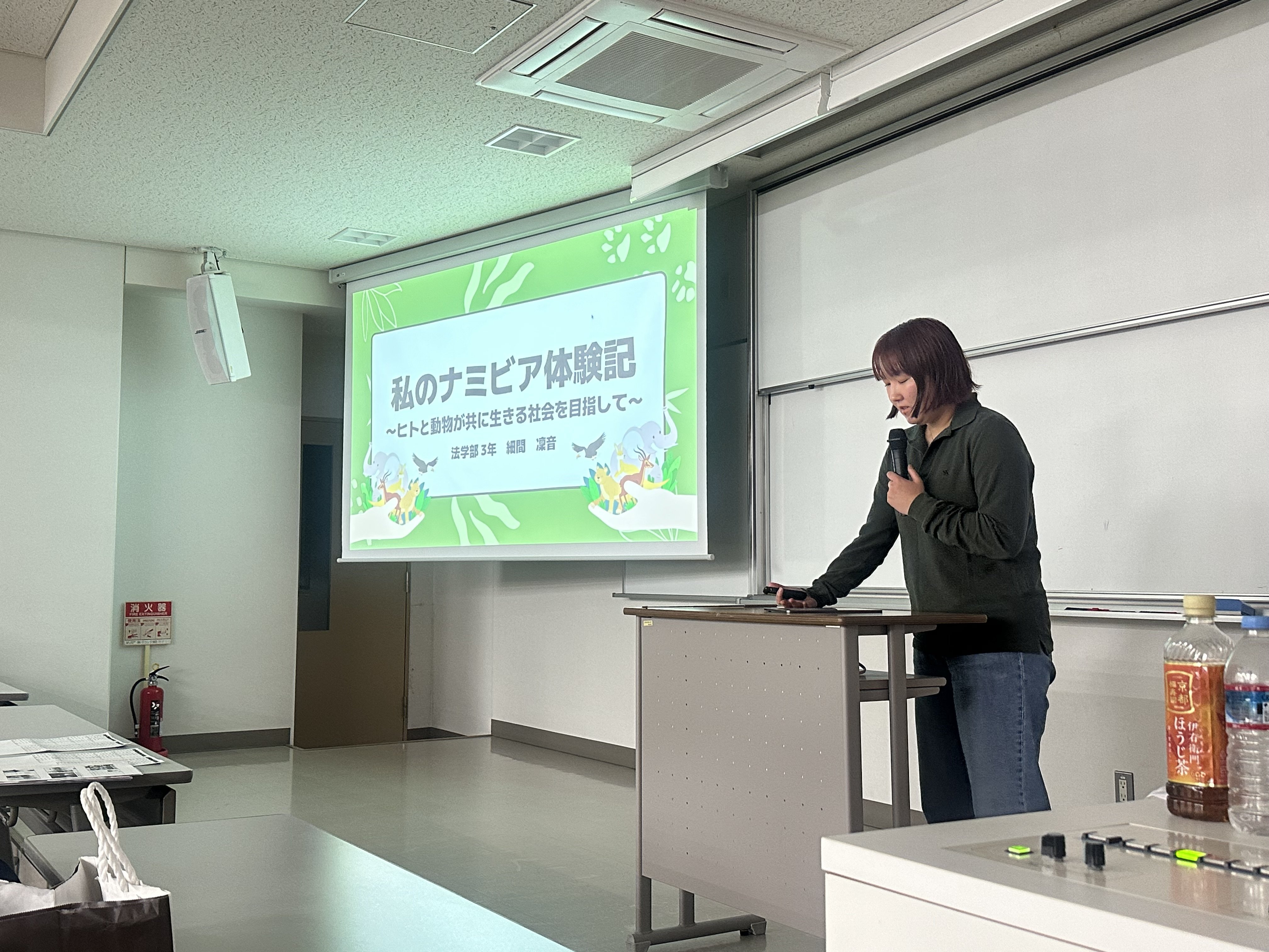後半は、3年次 細間 凜音さんがアフリカ南西部に位置するナミビアでの国連ボランティア活動に参加したことについて、「私のナミビア体験記~ヒトと動物が共に生きる社会を目指して~」と銘打ち発表しました。