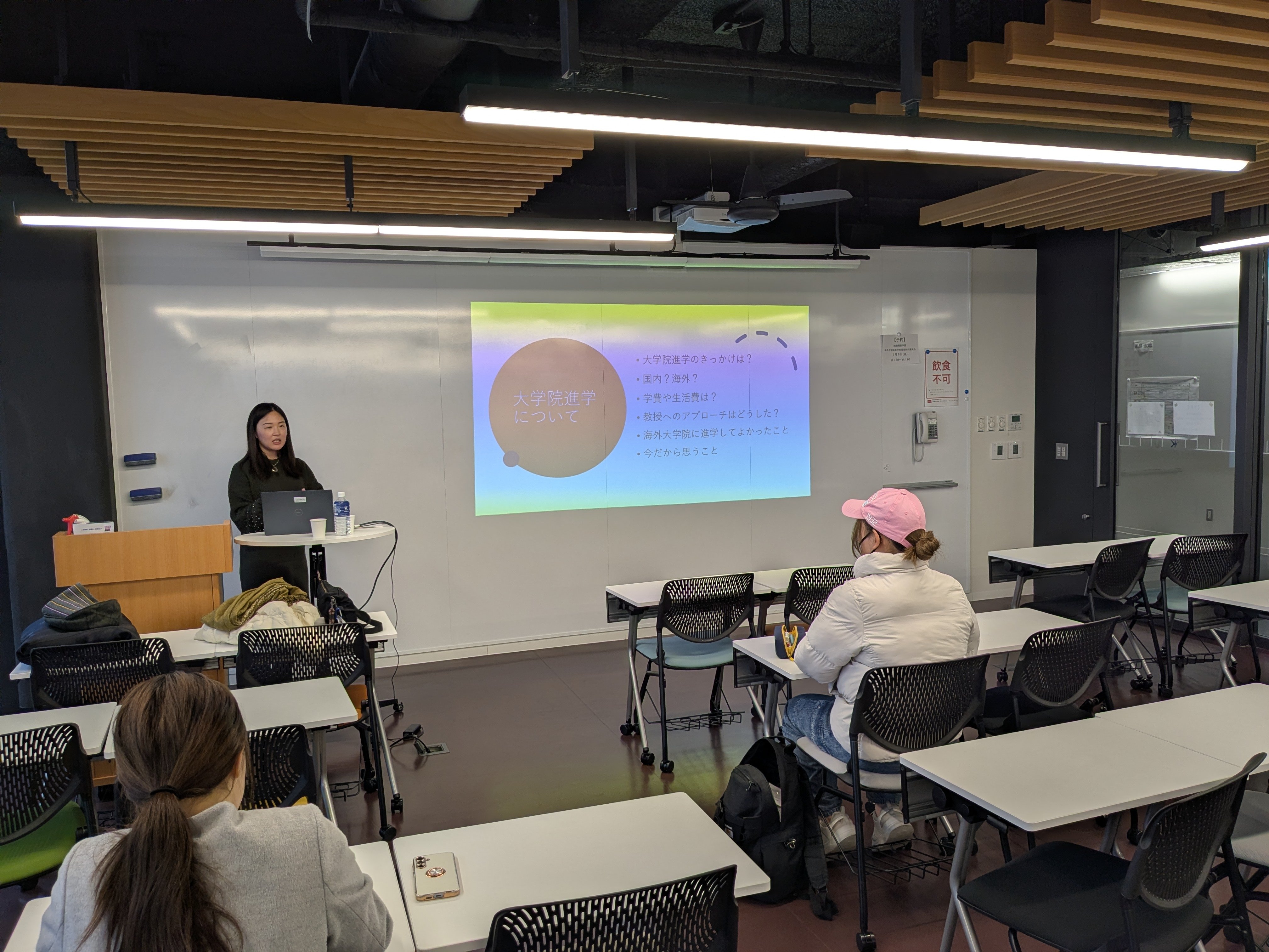 2026年1月9日(金)昼休み、岩﨑 さくら氏(2014年度外国語学部卒)をお招きして海外大学院進学希望者対象講演会が行われました。岩﨑さんは、京都産業大学を卒業後、フランスにあるエクス・アン・プロバンス大学へ進学、法学部人道法・人道支援学科の修士課程を修了されました。その後、大使館や外務省本省にてNGO関連のODA案件に携わり、現在は世界銀行シドニー事務所に勤め、太平洋州の保健案件や信託基金のマネジメントを担当しています。講演会では、日本政府と国際機関で働くことの違いや自身の職探しの経験をお話していただきました。また、講演会終了後、岩﨑さんと参加した学生で座談会を行い、ひとりひとりの質問に対し丁寧にアドバイスをいただきました。