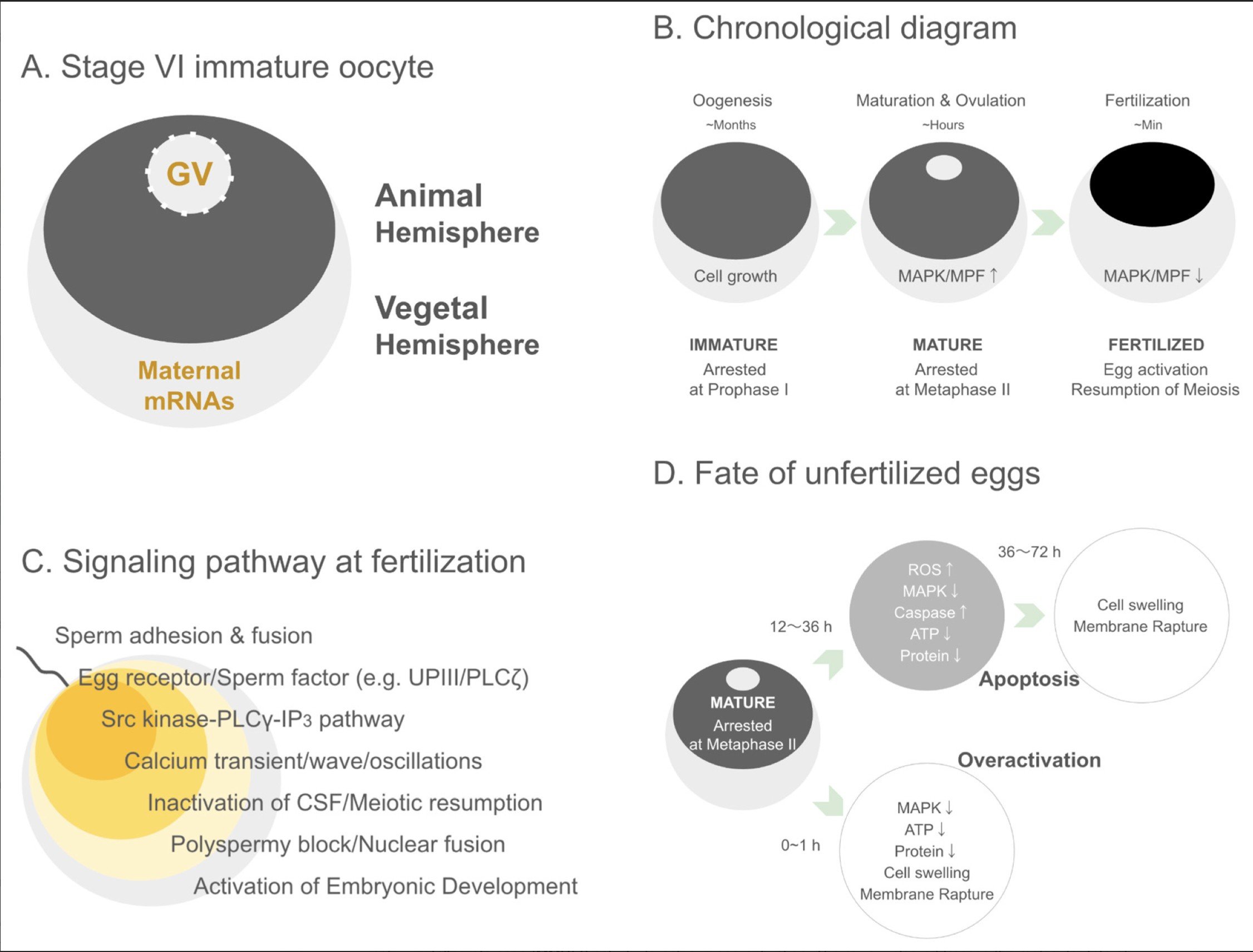 (D)未受精卵の運命 排卵後に受精が起こらなかった卵は、時間の経過とともに劣化していきます。12〜36時間後には、MAPK活性やATP量、タンパク質量の低下とともに、活性酸素(ROS)の増加やカスパーゼ活性化が進行し、最終的にアポトーシスへと至ります。その結果、36〜72時間後には細胞膨張と細胞膜破綻が起こります。一方で、排卵後0〜1時間以内に、過剰活性化(オーバーアクティベーション)が生じる場合もあり、この場合はMAPK活性の急激な低下、ATP枯渇、細胞質の急速な劣化、早期の膜破綻が引き起こされます。これらの異なる経路は、排卵後未受精卵が持つ代謝的・シグナル伝達上の脆弱性を示しています。