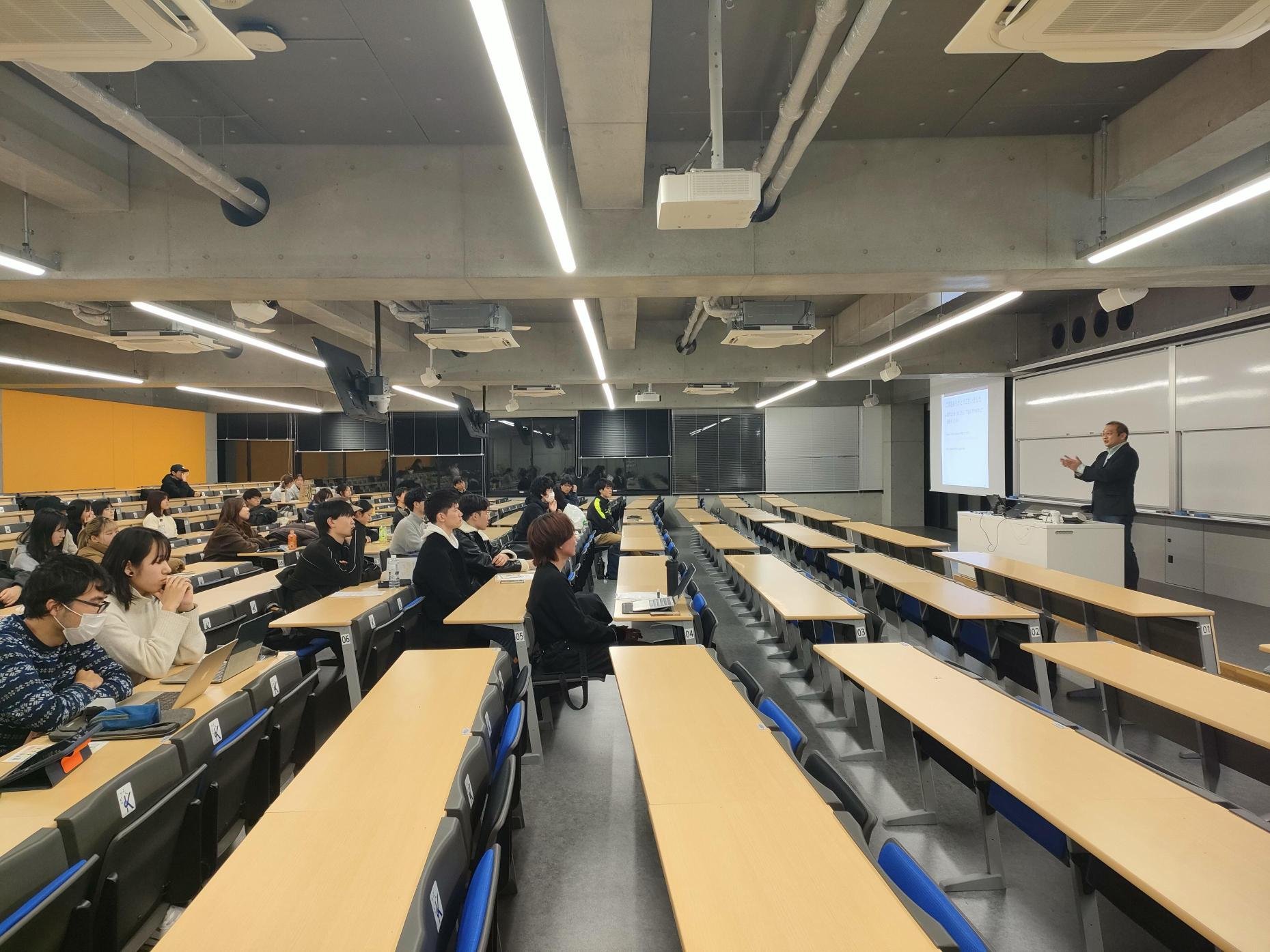 セミナーは、山本氏からの「恥ずかしがらず積極的に発言することが大切」という言葉から始まり、講師と学生が対話を重ねる形式で進行されました。冒頭では、研究者・企業人として国内外で経験されたこれまでの挑戦や、起業に至るまでの経歴をリアルなエピソードを交えてご紹介いただき、学生たちはその経験談に強く引き込まれている様子でした。