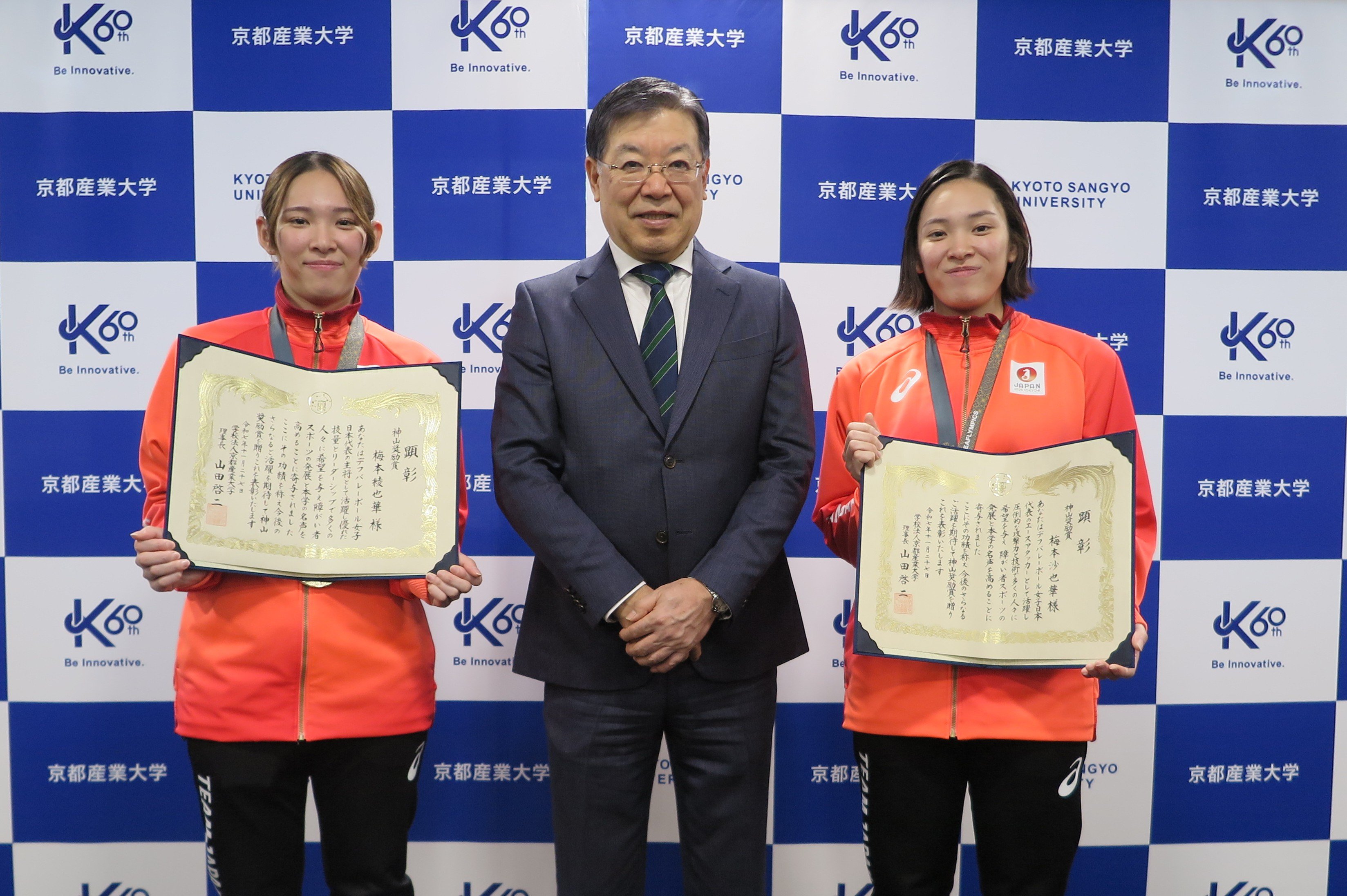 | 在学中からデフバレーボール日本女子代表チームの中心選手として、国際舞台で輝かしい実績を残してこられました。「東京2025デフリンピック」では、綾也華さんは日本代表の主将、沙也華さんもエースアタッカーとして活躍し、見事金メダルを獲得。聴覚にハンディキャップを持ちながらも、その挑戦と成果は、スポーツの枠を超えて、障がい者スポーツの可能性と社会的意義を示すものであり、今後のさらなる活躍が期待されます。 |