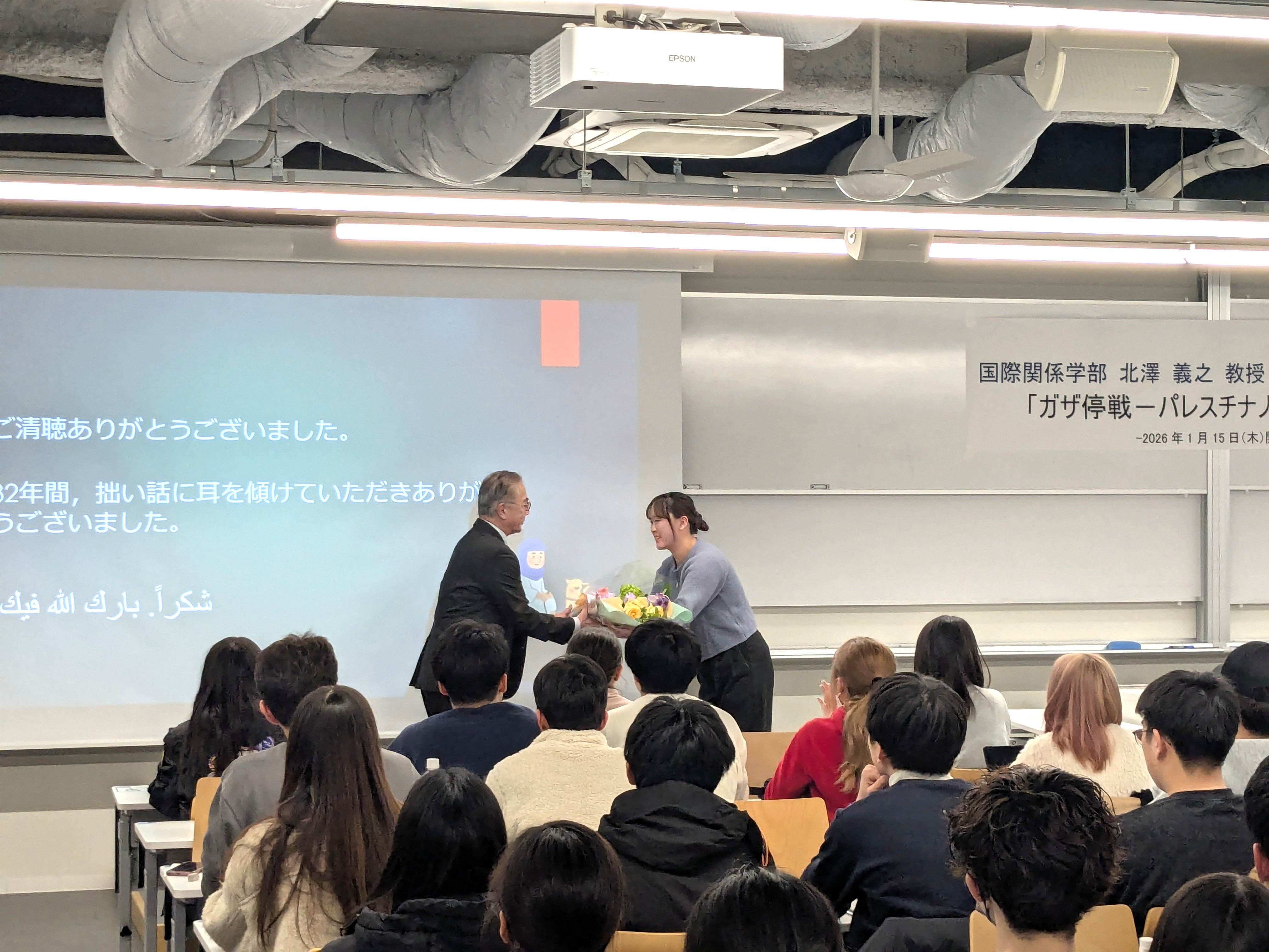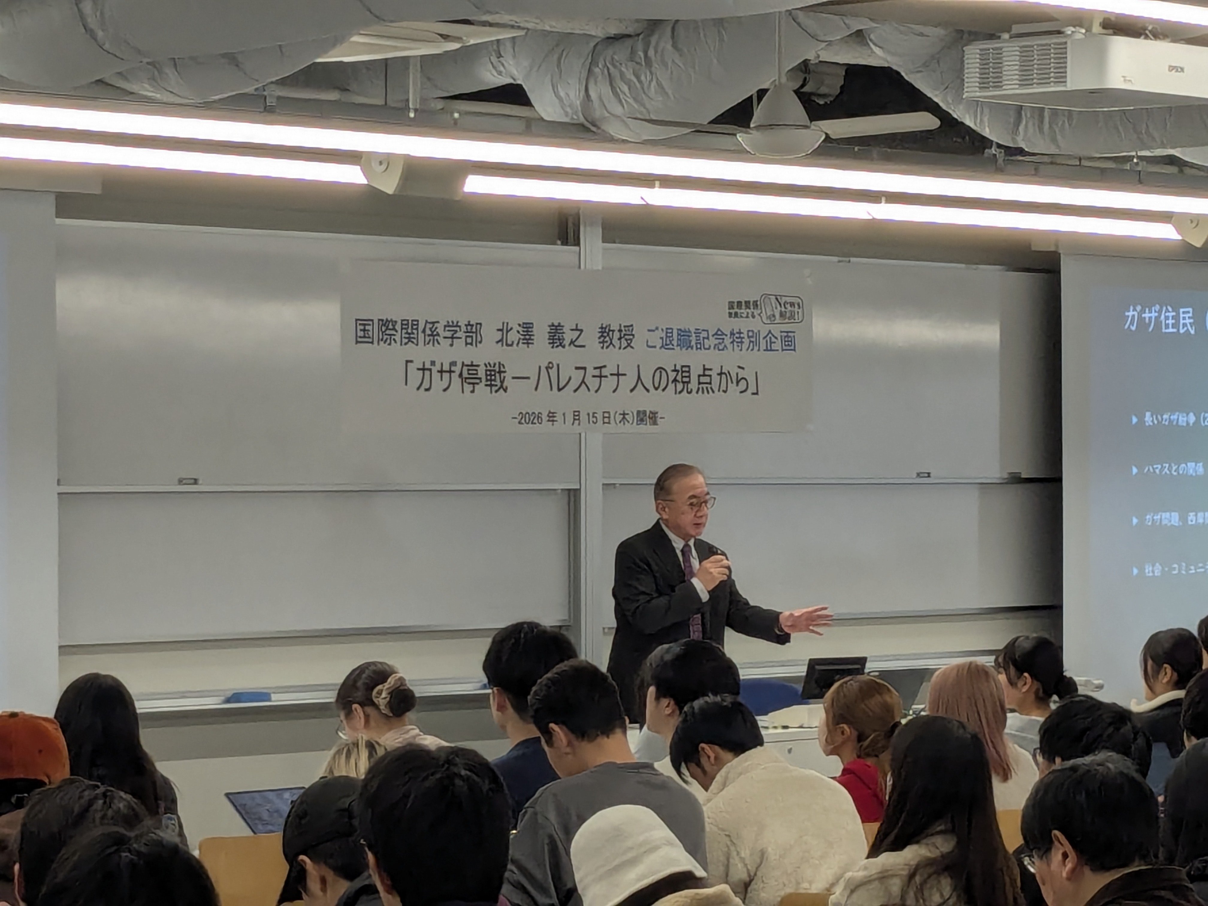 2026年1月15日(木)昼休みに、国際関係学部独自の定例イベント「News解説ワークショップ」の特別企画が開催されました。今回は、2026年3月末をもって退職される北澤義之教授の最終講義として、「ガザ『停戦』―パレスチナ人の視点から」をテーマに行われました。国際関係学部の学生や教員の多くが参加し、長きにわたり中東地域研究から国際関係を分析してこられた北澤教授の含蓄深いお話に耳を傾ける貴重な機会となりました。