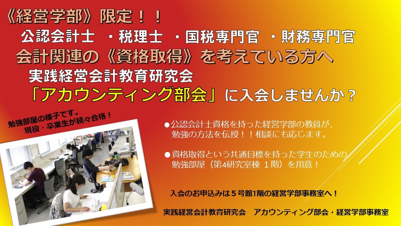当部会に所属する学生には、共同の勉強部屋が与えられ、そこで資格取得にいつでも専念でき、また、同じ志をもった学生が集まることで、やる気を更に高めることができます。より高度な資格取得に頑張る皆さんには、公認会計士資格を持った先生方が勉強の方法や悩みに応えてくれるのも本部会の大きな魅力です。公認会計士試験に現役合格した学生もいます。
