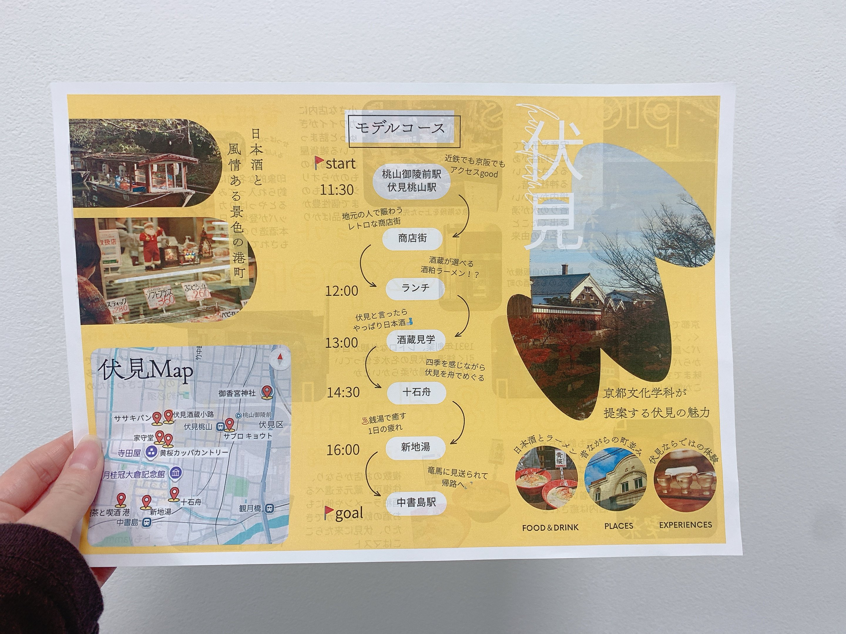 京都市産業観光局観光MICE推進室クラスでは、「京都の隠れた魅力を活かした観光の推進~観光客の満足度を高めつつ、観光の分散化を図る~」という課題に取り組みました。学生たちは、伏見地域を対象に、クラフトビールの試し呑みや学生割引を導入した伏見十石舟の観光、商店街におけるクーポンガチャ設置など、多様な施策を提案しました。さらに、伏見の実地調査の成果をもとに伏見観光モデルを掲載したパンフレットを作成し、地域の魅力を効果的に発信する方法についても提案しました。