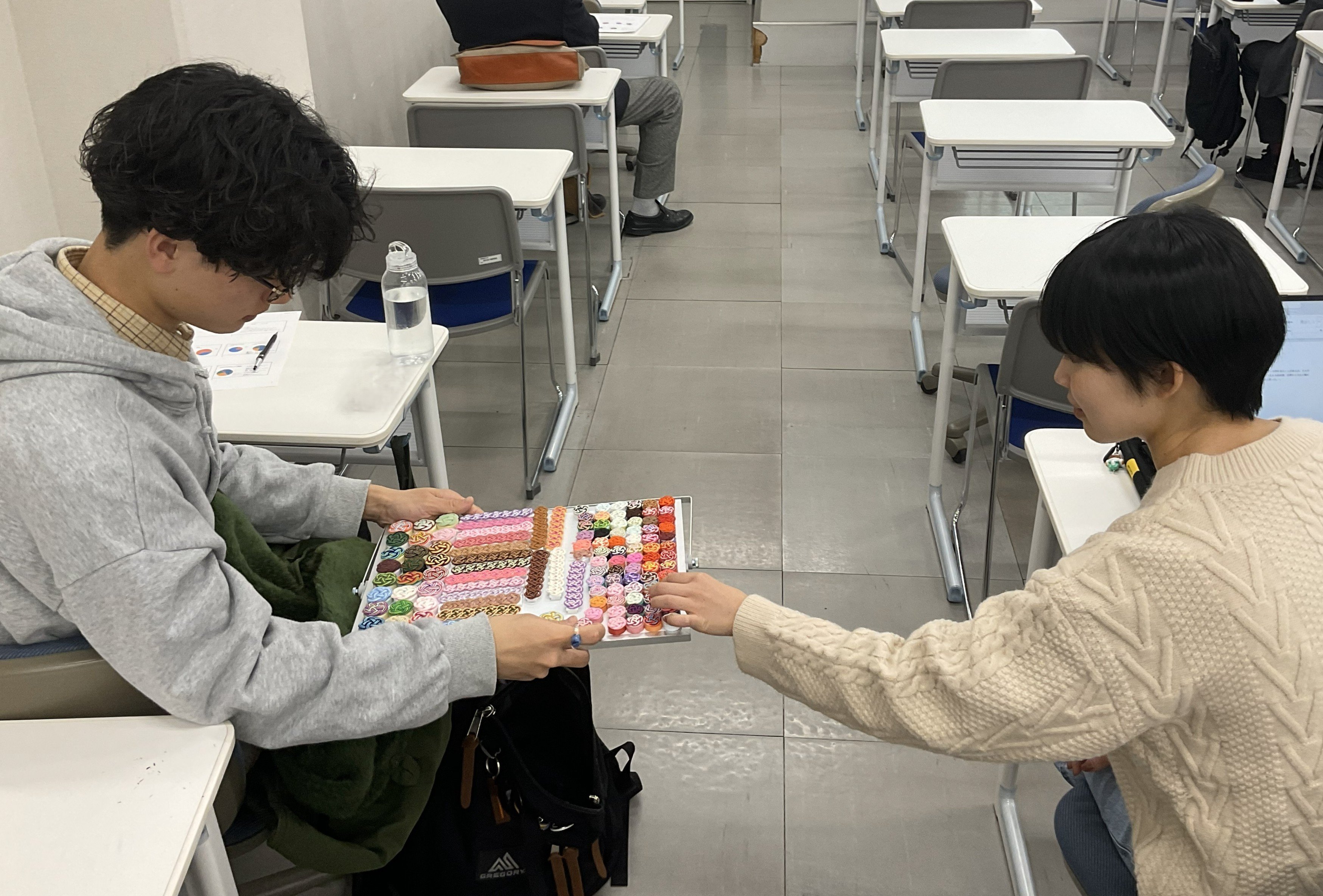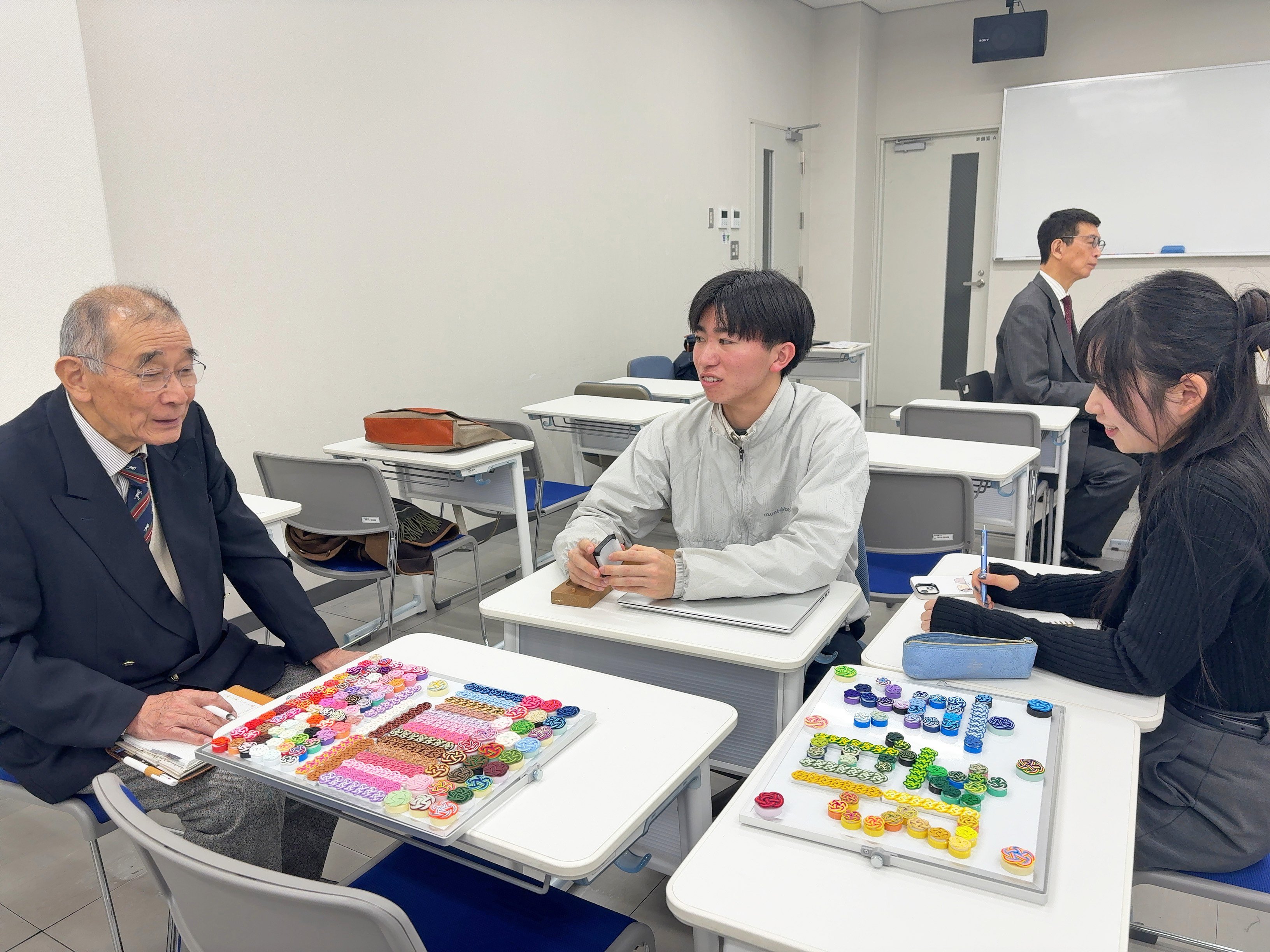 京都伝統産業ミュージアムクラスでは、「京都の伝統工芸品である『結納飾・水引工芸』の用途開発について」という課題に取り組みました。学生たちは、結納離れが進む現代において、水引の認知度を高めるとともに、伝統工芸を日常生活に取り入れることを目指し、2025年12月15日(月)および12月19日(金)の2回にわたり、体験型ワークショップの企画・運営を行いました。最終報告会ではその成果を踏まえ、壁面装飾や教育分野での活用、さらには贈答文化に応じたオーダーメイド小物への展開などについて提案しました。