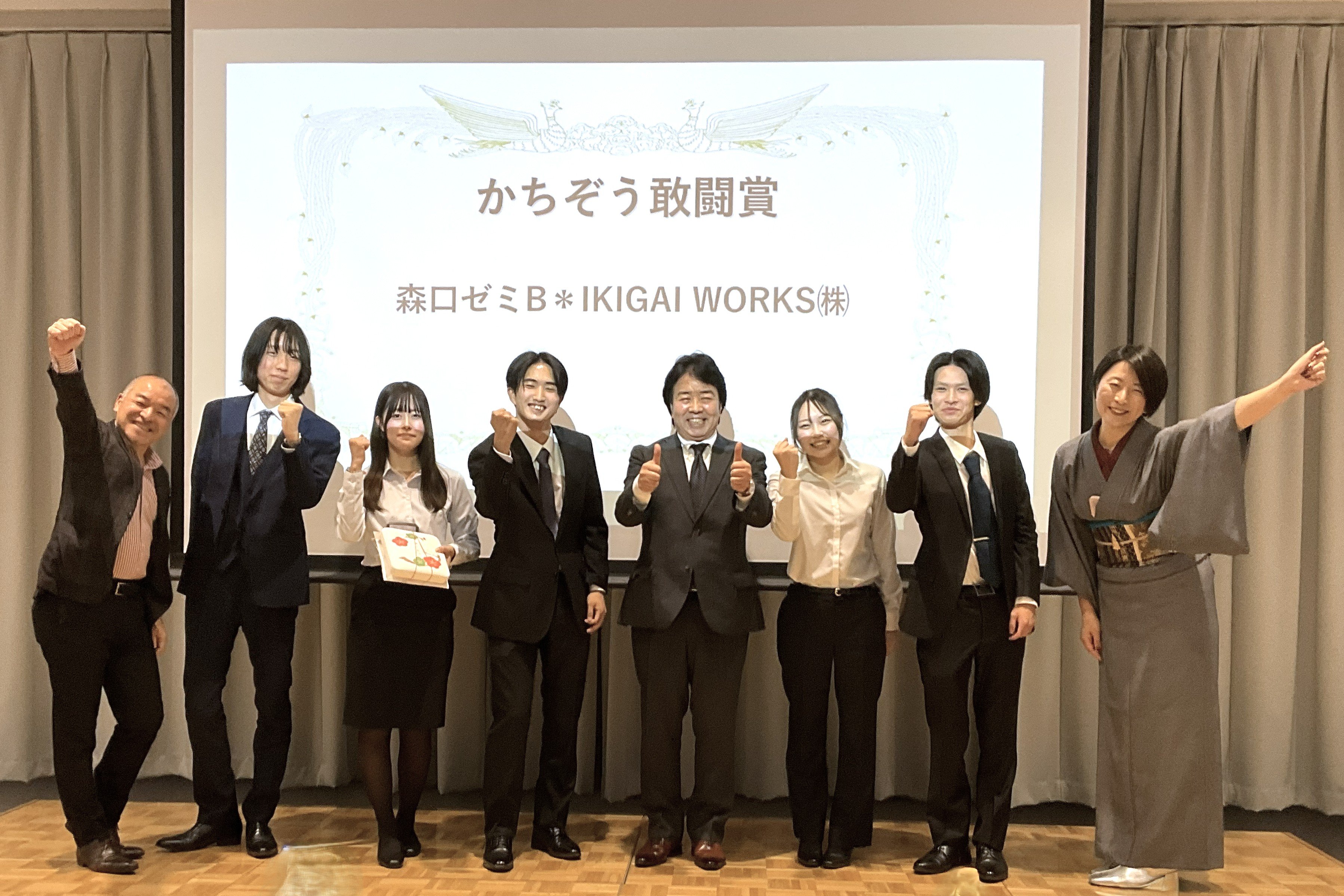 また、審査結果が発表される際は、各チームは緊張しながら、審査結果と貴重な講評を聞きました。結果は、「森口ゼミB× IKIGAI WORKS 株式会社」の発表が「敢闘賞」を獲得しました。学生たちが喜びを分かち合う姿がありました。