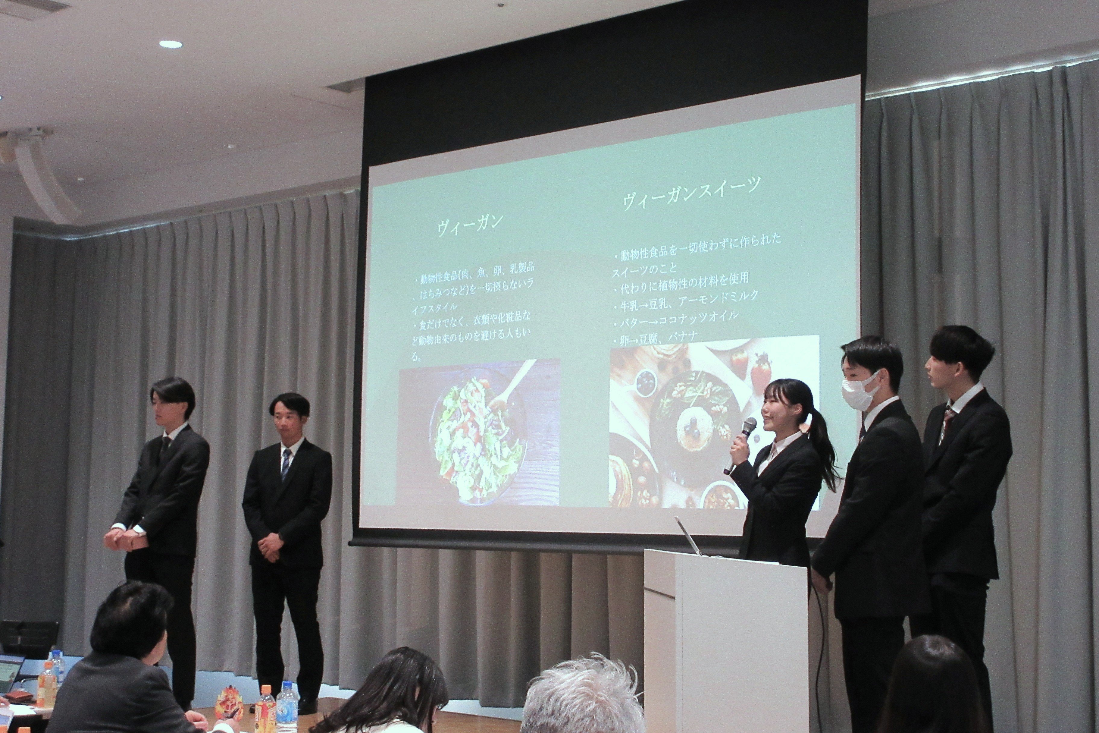 - 柴野ゼミA:若者向けのヴィーガンスイーツを企業と共同で開発し、食物繊維が豊富で低カロリーの間食として訴求することにより、偏食傾向の改善を図る提案を行いました。