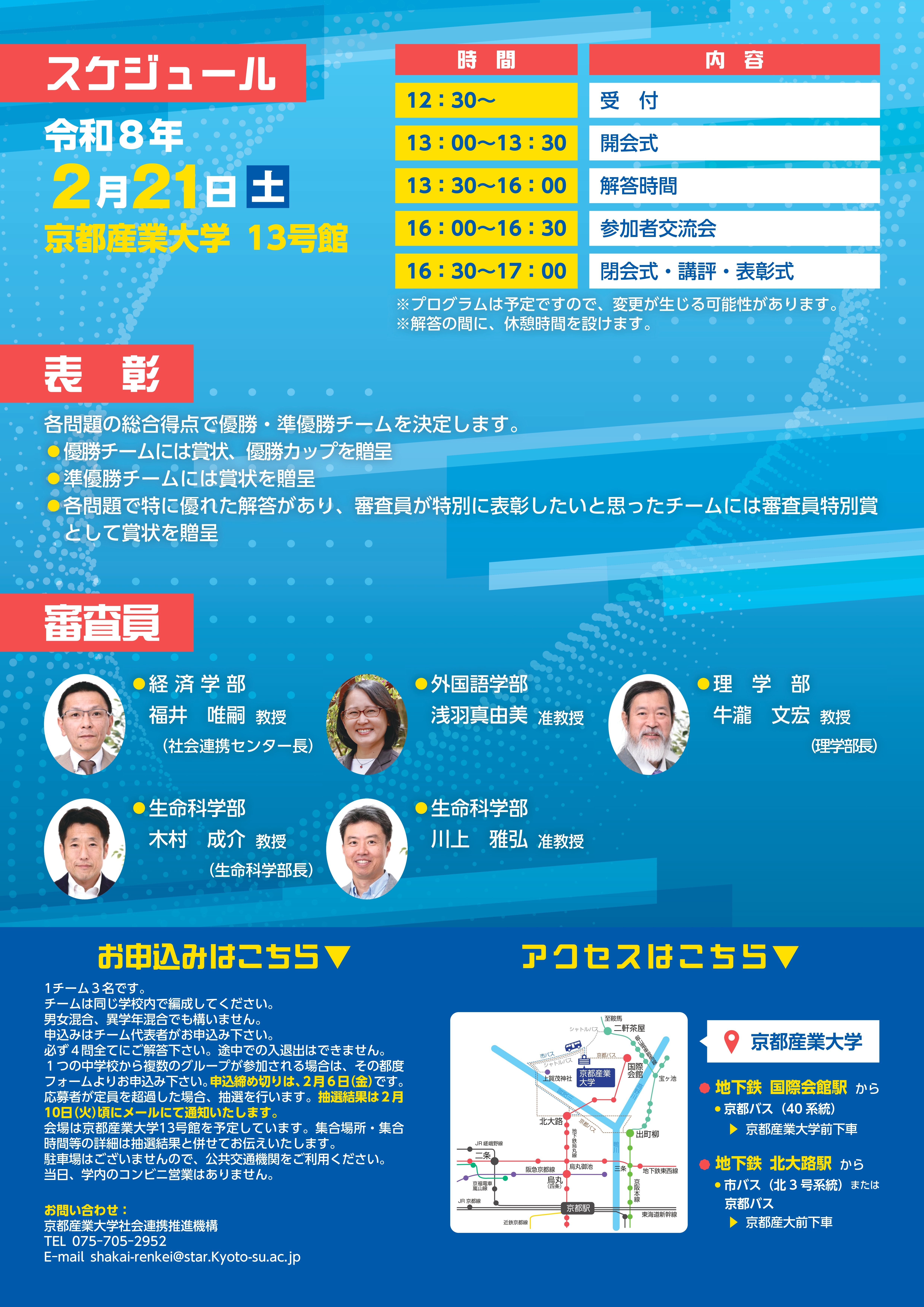 京都産業大学と株式会社新興出版社啓林館は、2026年2月21日(土)、中学生を対象としたZest of Living(生きる力)イベント「Best Solution All Comer 神山杯」を京都産業大学にて開催します。中学生がチームで協力して答えのない課題に挑み、最適解を導き出すチャレンジイベントとなりますので、ぜひ取材いただき、広くご紹介くださいますよう、よろしくお願い申し上げます。