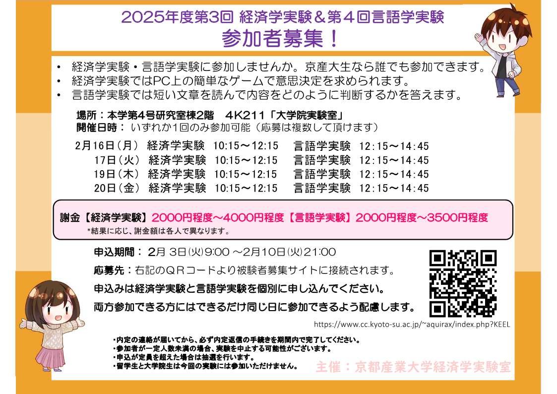 経済学・言語学実験に参加しませんか。京産大生なら誰でも参加できます。