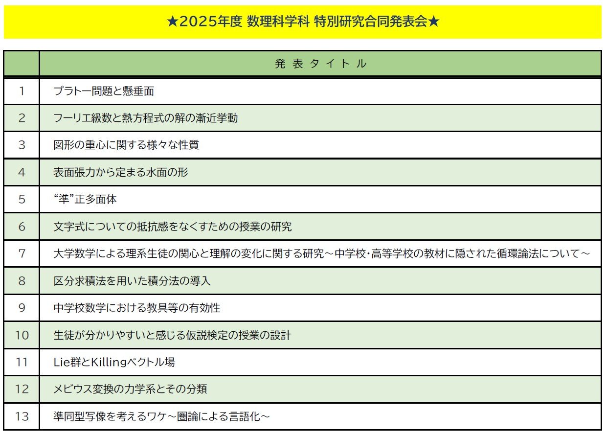 2026年2月4日(水)に理学部数理科学科の緒方 勇太 准教授、長瀬 睦裕 准教授、濱野 佐知子 教授、三好 博之 教授、山田 修司 教授、渡辺 達也 教授、の4年次ゼミ生15名による特別研究合同発表会を開催しました。
