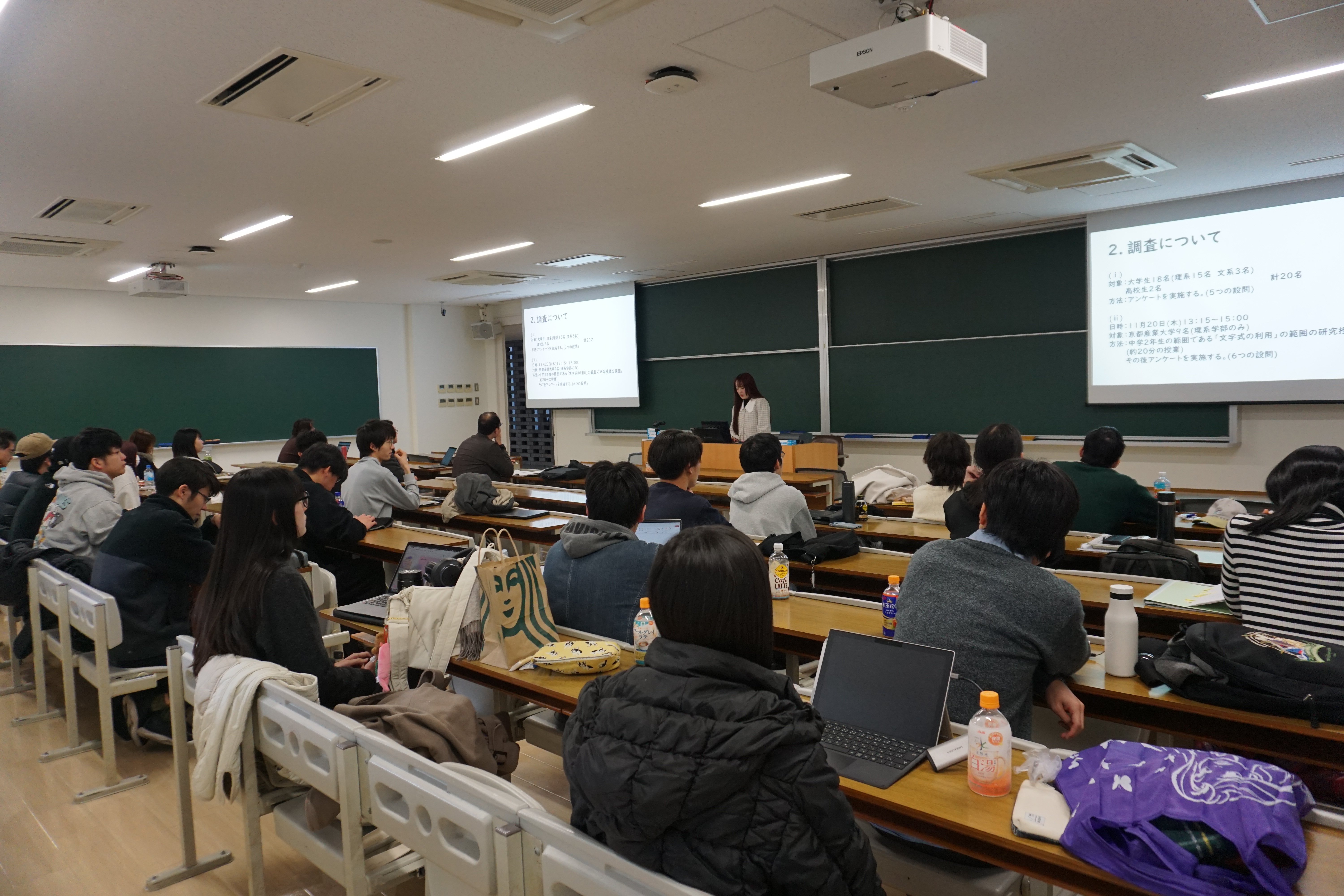 数理科学科では、それぞれのゼミ生が担当教員の指導のもと卒業研究に取り組み、研究内容の発表を行います。発表会には数理科学科の3年次生から4年次生・大学院生や教員など、たくさんの方が参加しました。