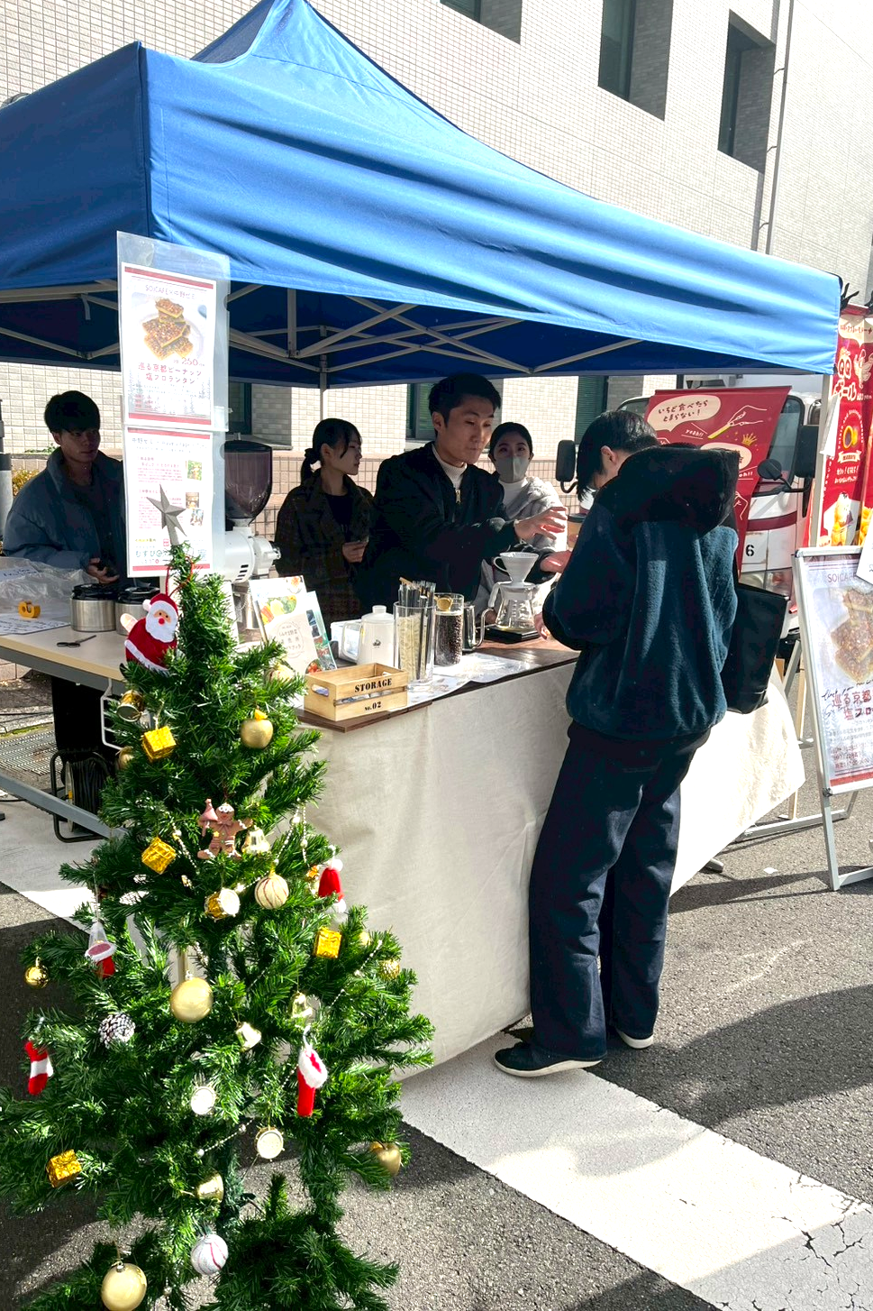 学外で1月に行われた「クロスピア市 むすびのマルシェ」では、単品300円、コーヒーセットで450円(クーポン使用で350円)で販売し、たくさんの方に来場していただきました。