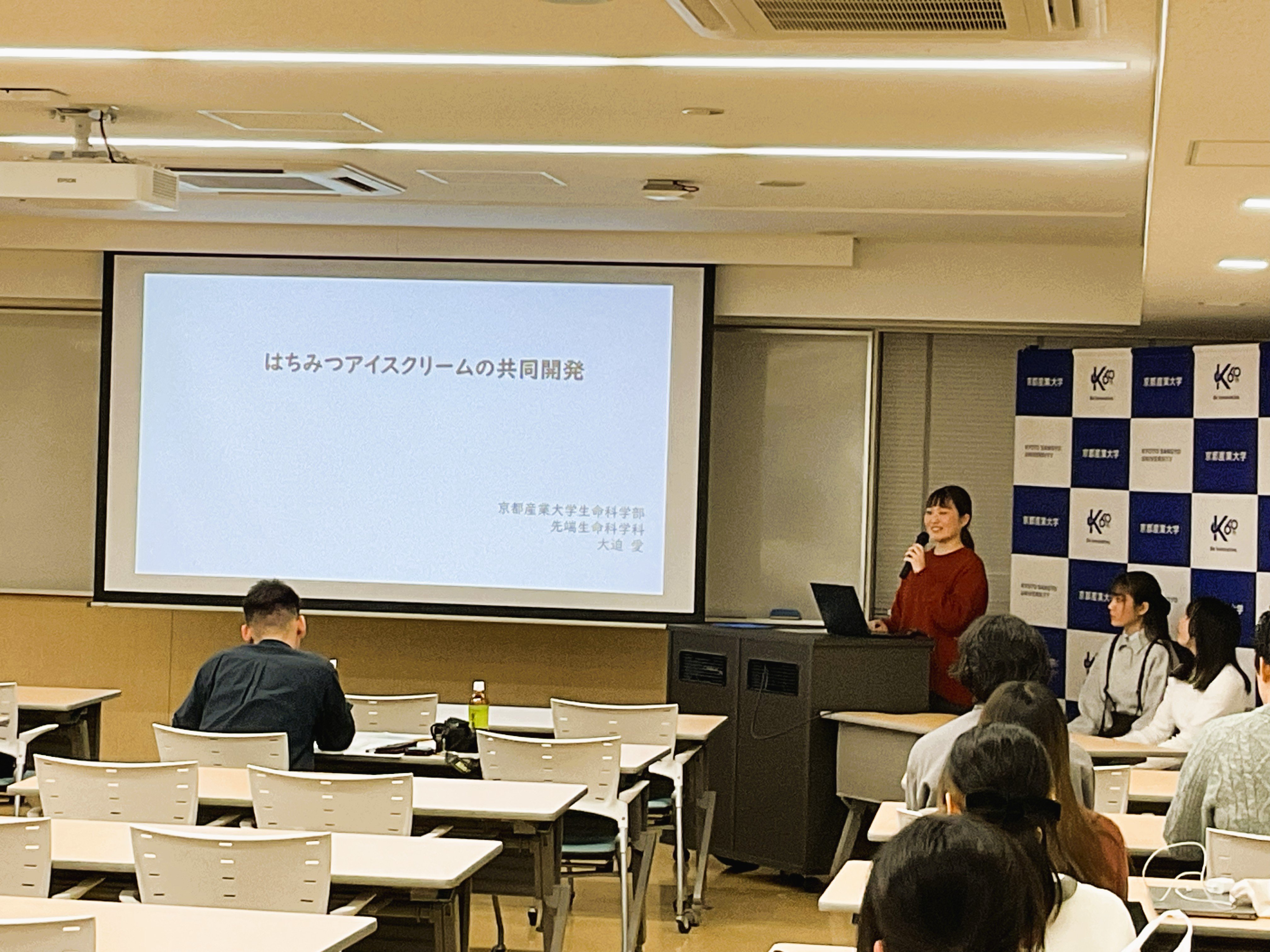 生命科学部先端生命科学科3年次生の大迫愛さんからは、南部高校「食と農園科」の生徒と本学学生が、大学産の蜂蜜を活用したコラボアイスを共同開発したことについて説明をしました。