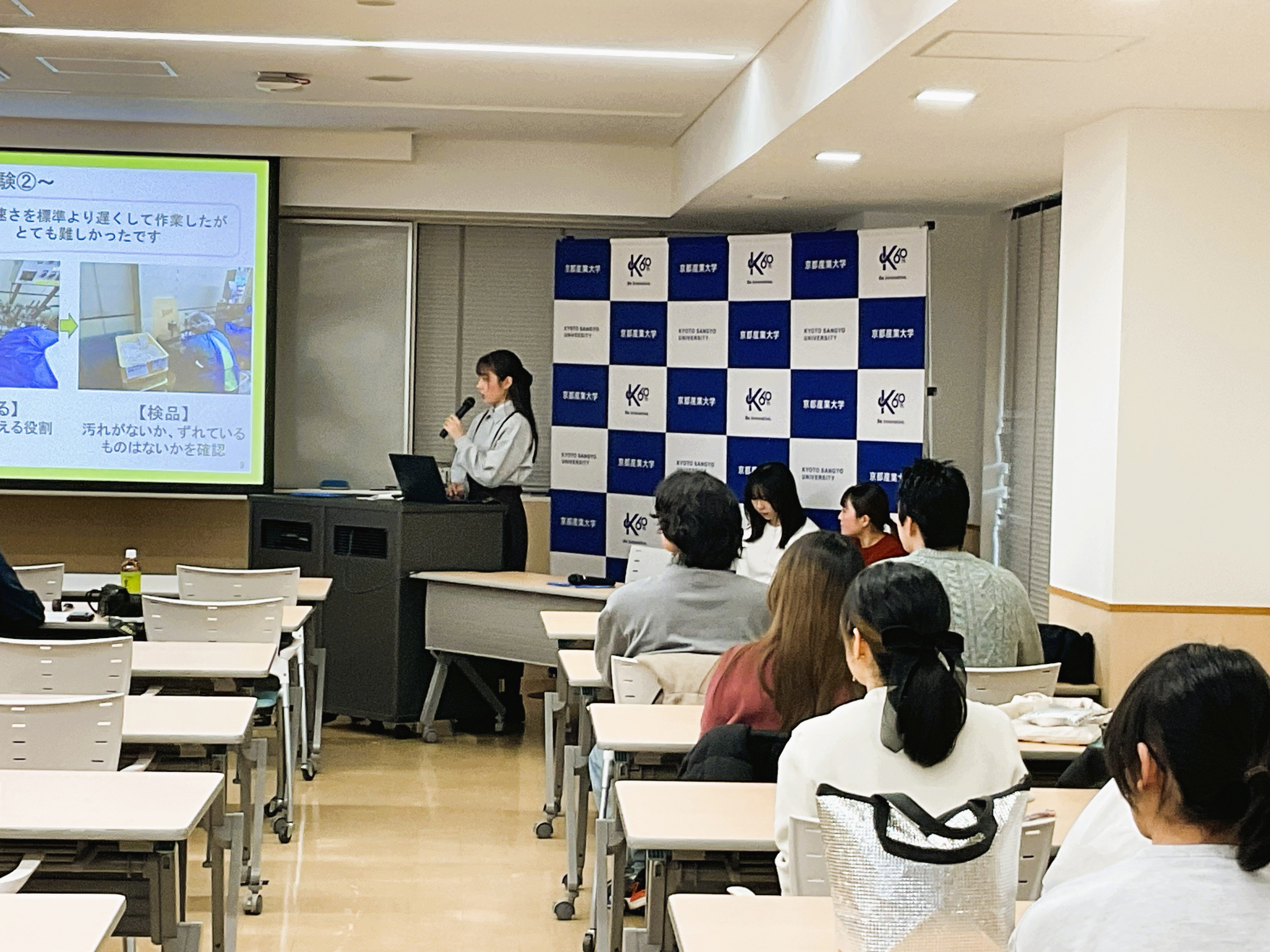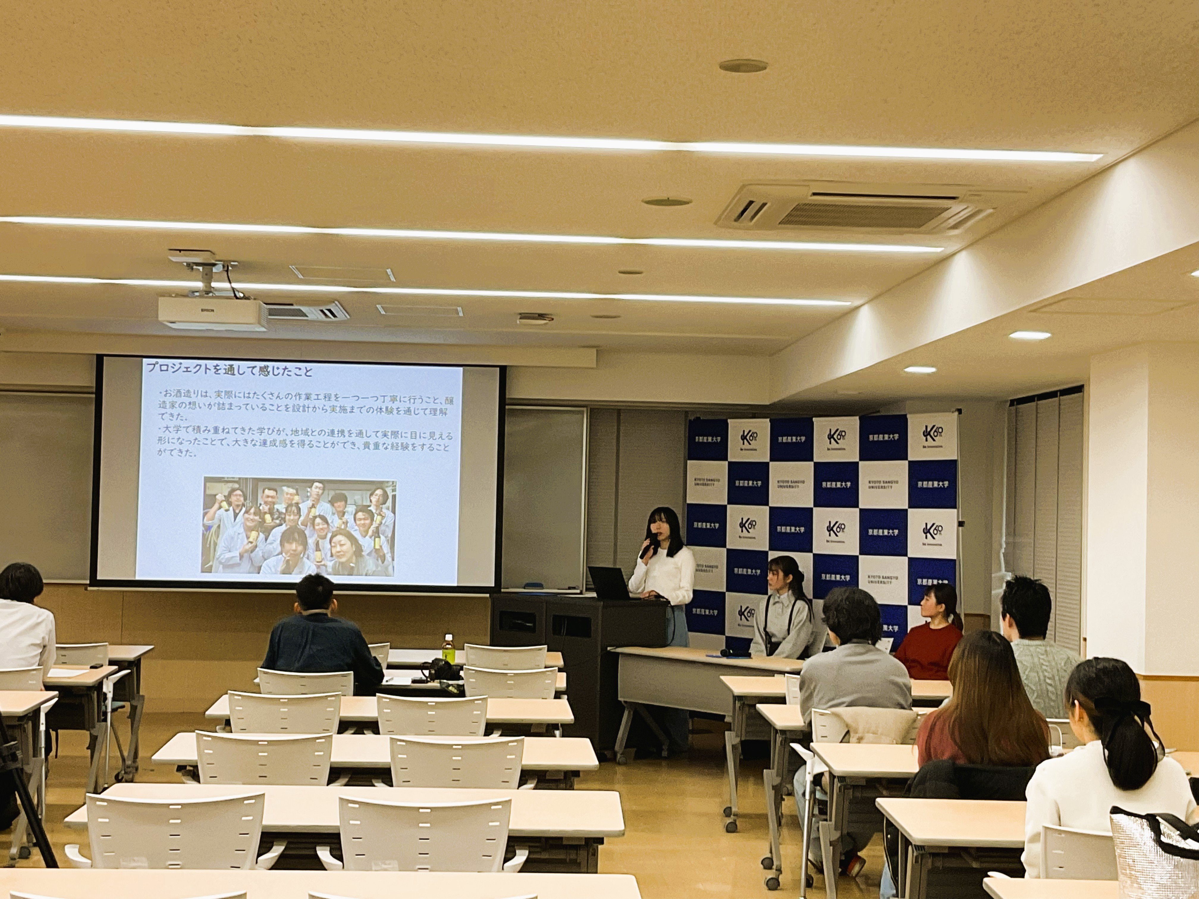 生命科学部産業生命科学科4年次生の久下愛実さんより、世界農業遺産の地・和歌山県みなべ町を舞台に、梅の収穫・選果・塩漬け・天日干し・はちみつ漬け・包装までの一連の工程を体験したことについて説明しました。