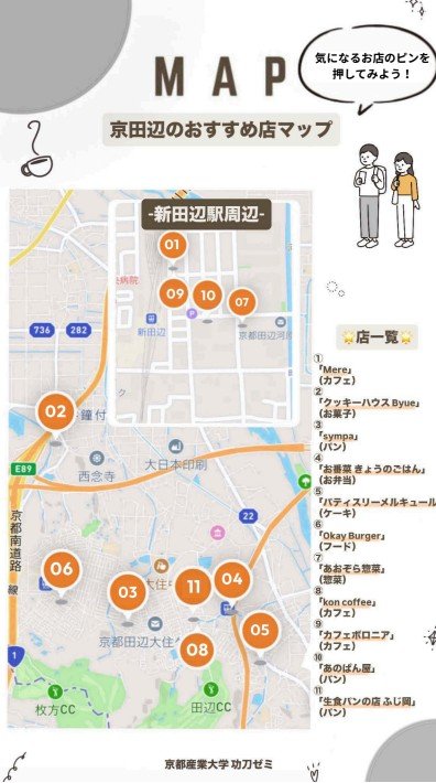 今年度はその経験を生かし、ゼミ生が主体となって、新たに「京田辺市のおすすめ店」と「京都産業大学周辺のカフェ」の2つのマップづくりに挑戦しました。