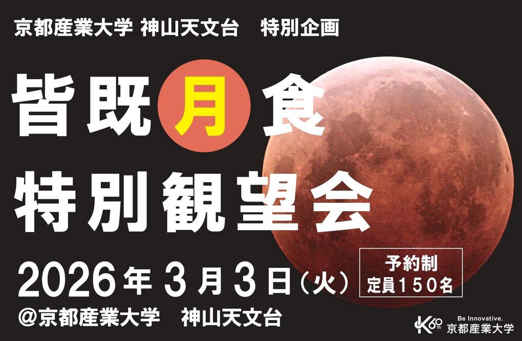 京都産業大学神山天文台は、2026年3月3日(火)に日本全国で観察できる皆既月食に合わせ、特別観望会を開催いたします。今回の皆既月食は、部分食の開始が18時50分頃、皆既食が20時04分頃から約1時間続くとされ、観察条件の良い天文現象です。